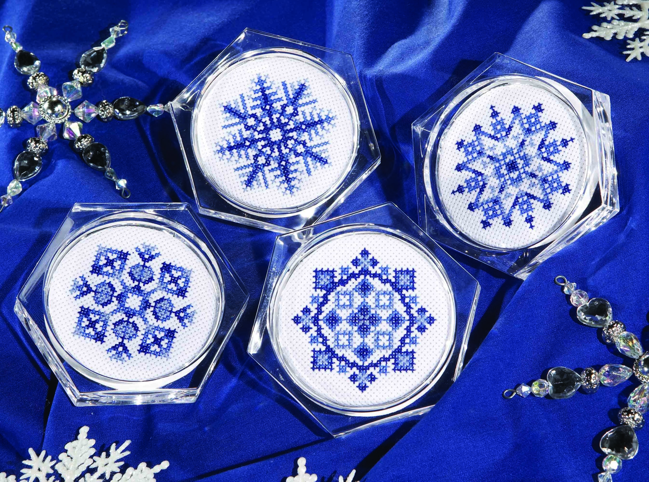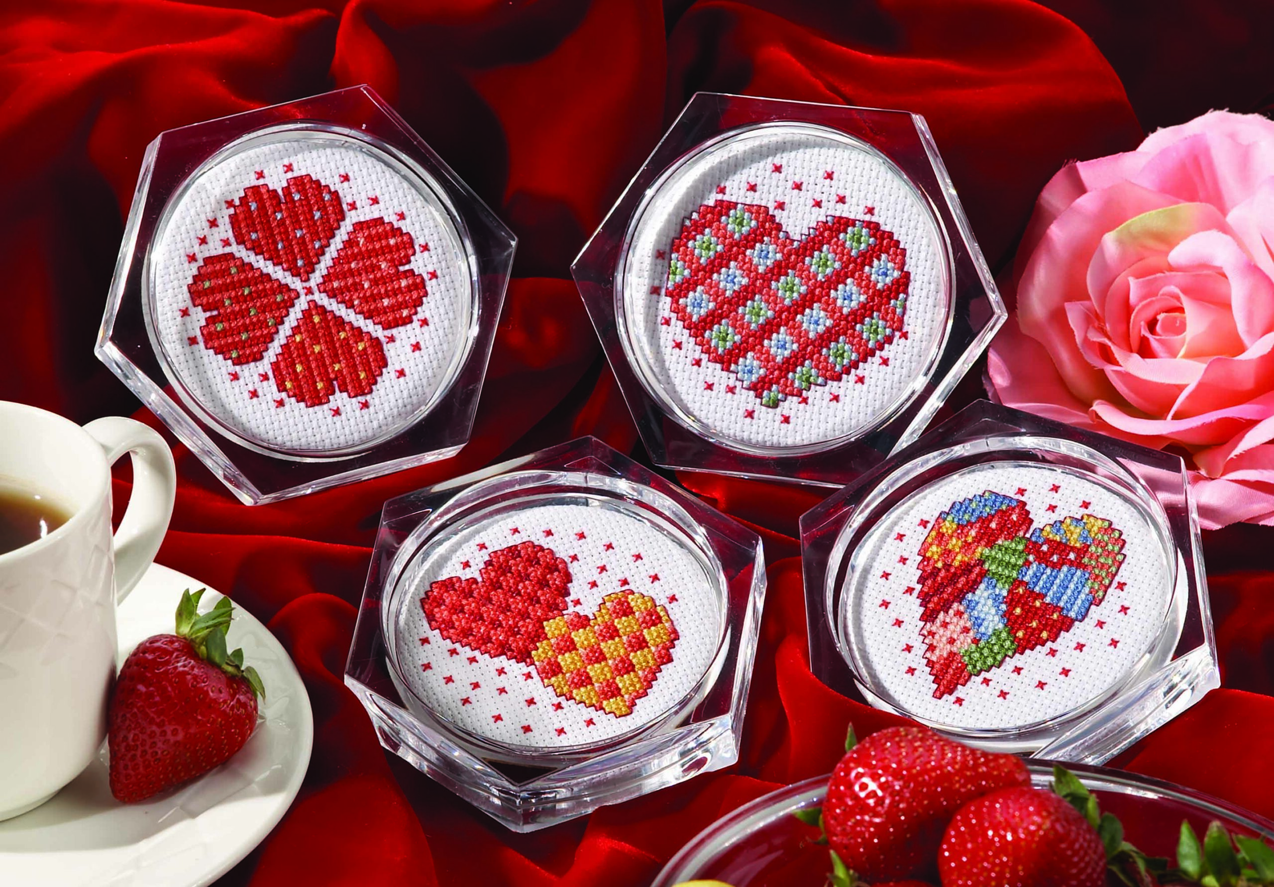 Cross Stitch Coasters- Add a little pizzazz to your table top with these cross stitch designs for clear acrylic coasters. With a variety of styles from which to choose, you’ll find designs that are perfect for all your needs. These Herrschners designs include: hearts, snowflakes, gingerbread men, tea cups, and more. Shown on 14 count fabric. Finished coaster designs fit on a 4″x 4″ fabric square. Beginner friendly. 16 pages, softcover.