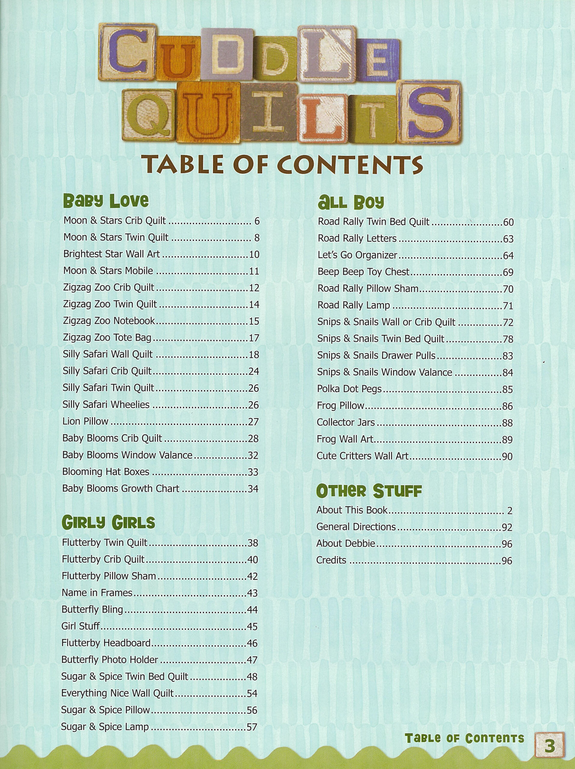 Cuddle Quilts For Little Girls & Boys- Welcome and nurture those precious little ones by creating quilts, crafts, and decor. Designer Debbie Mumm helps you release your inner child as you cuddle up the kids. Over 50 fun projects include: flutterby pillow sham, sugar and spice pillow, baby blooms growth chart, snips and snails twin bed quilt, and more. 96 pages, soft cover.