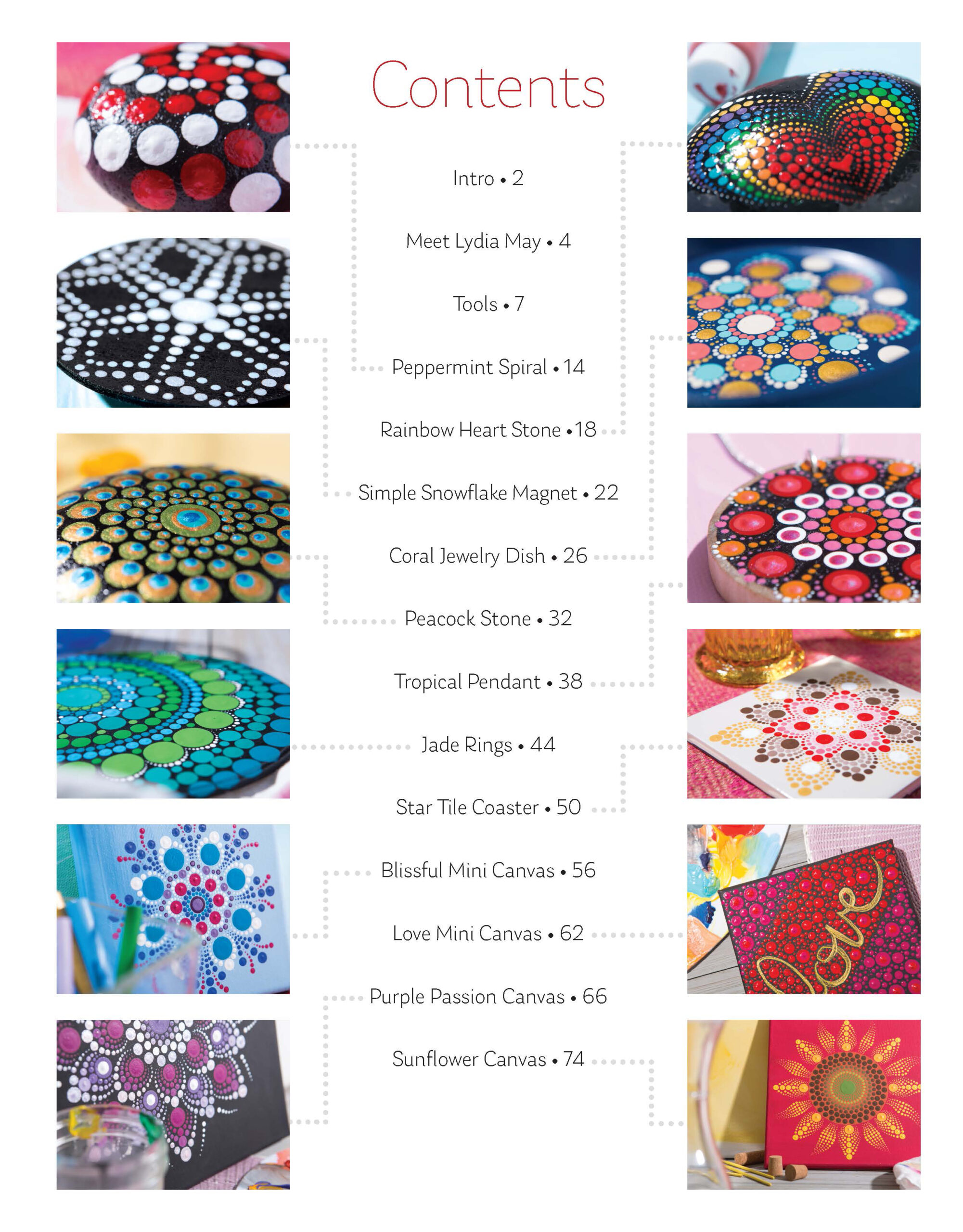 Dot Painting- Love at first dot. Dot painting is a very popular rock painting technique that has been taken to the next level. From intricate mandalas to simple starts, dot painting is quick and easy for all skill levels. Once you dot you can’t stop. Designs include: peppermint spiral, coral jewelry dish, peacock stone, jade rings, purple passion canvas and more. Required supplies include paint, a paintable surface and your choice of dotting tool: pencils, wooden dowels, crochet hooks, nail dotting tools and more. Acrylic paint recommended. Beginner skill level. 80 pages, soft cover.