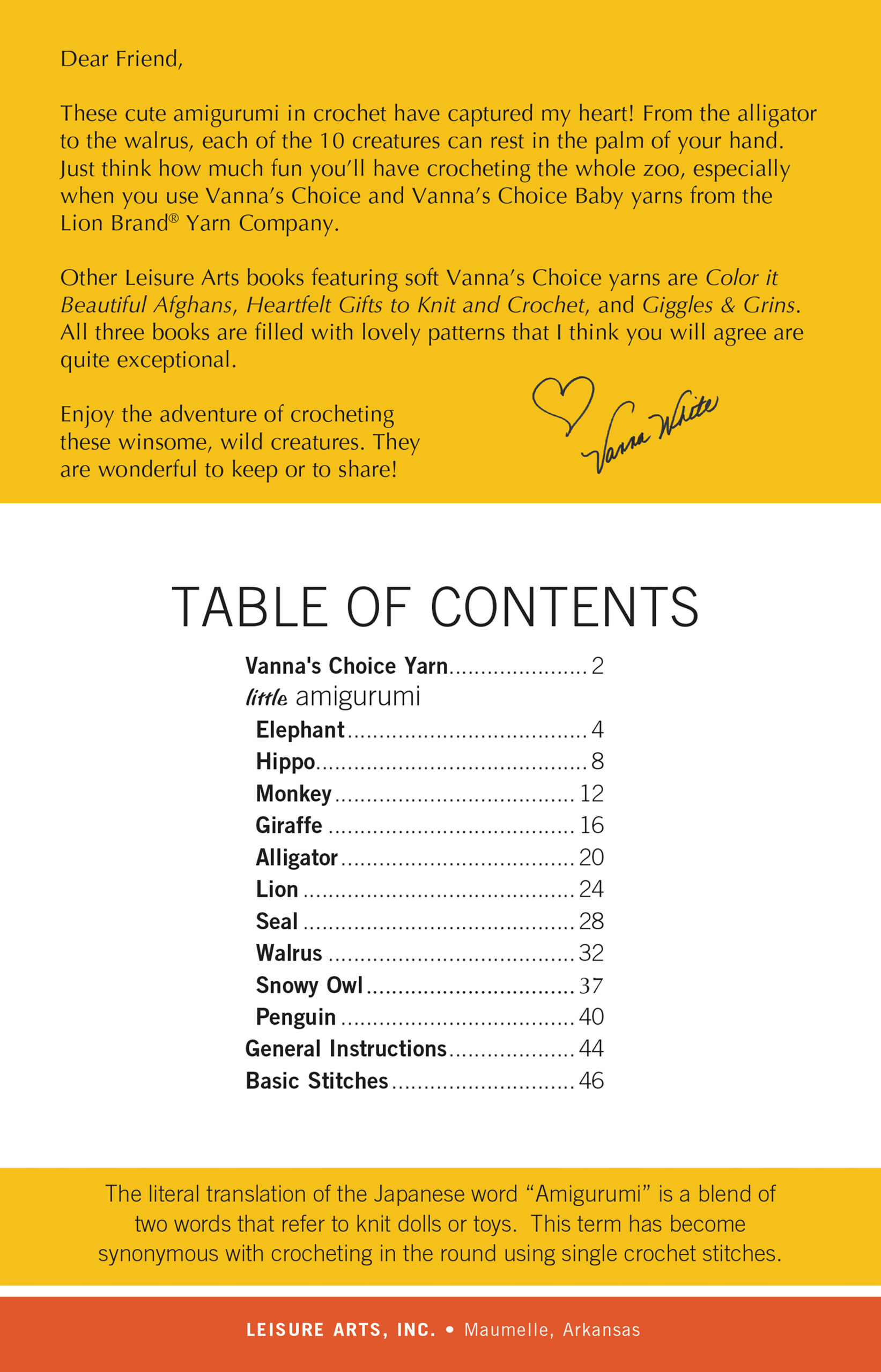 Easy Crochet Critters- Vanna White, the popular TV game show co-host and America’s favorite crocheter, presents 10 little amigurumi animals that will capture your heart. Enjoy the adventure of crocheting these winsome, wild creatures. They are wonderful to keep or to share. Designs include: elephant, hippo, monkey, giraffe, alligator, lion, seal, walrus, penguin, and snowy owl; each small enough to rest in the palm of your hand. All designs are for easy skill level and require US size 4 medium weight yarn and a G-6, 4 millimeter, hook. Additional materials needed include fiberfill, stitch markers and yarn needles. Finished sizes range from 4″ to 8″ tall and are endlessly adorable. Pocket size has 48 pages, soft cover.