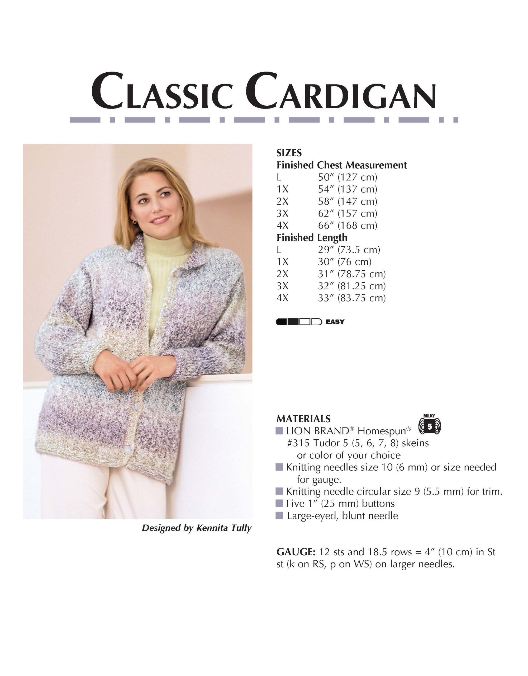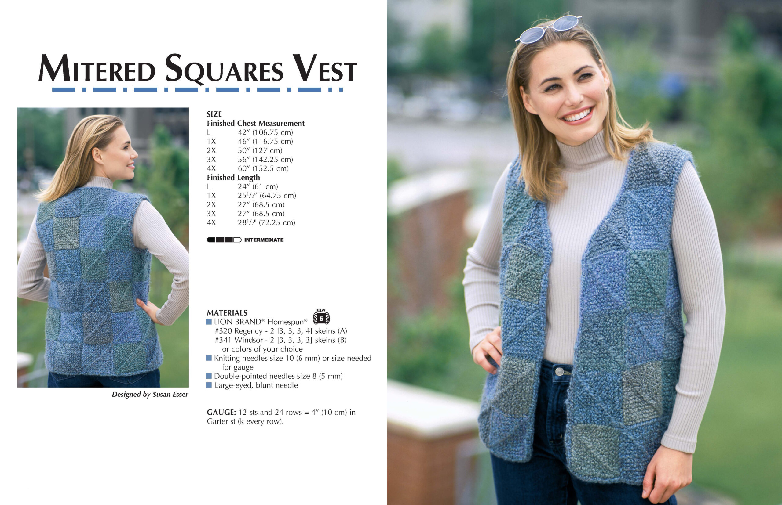 Fashion-Plus Knits- Eight beautifully knit garments offered in plus-sizes for varied skill levels from easy to intermediate. Homespun, a size 5 bulky weight yarn by Lion Brand Yarn Company, is used for each project. Flattering designs, in sizes large to 4X, with finished chest measurements ranging from 50″ through 72″ when knit to gauge on size US 8 through US 11 knitting needles. Includes: two vests, a pullover, kimono, cardigan, coat, shawl, and wrap. 32 pages in a softcover.