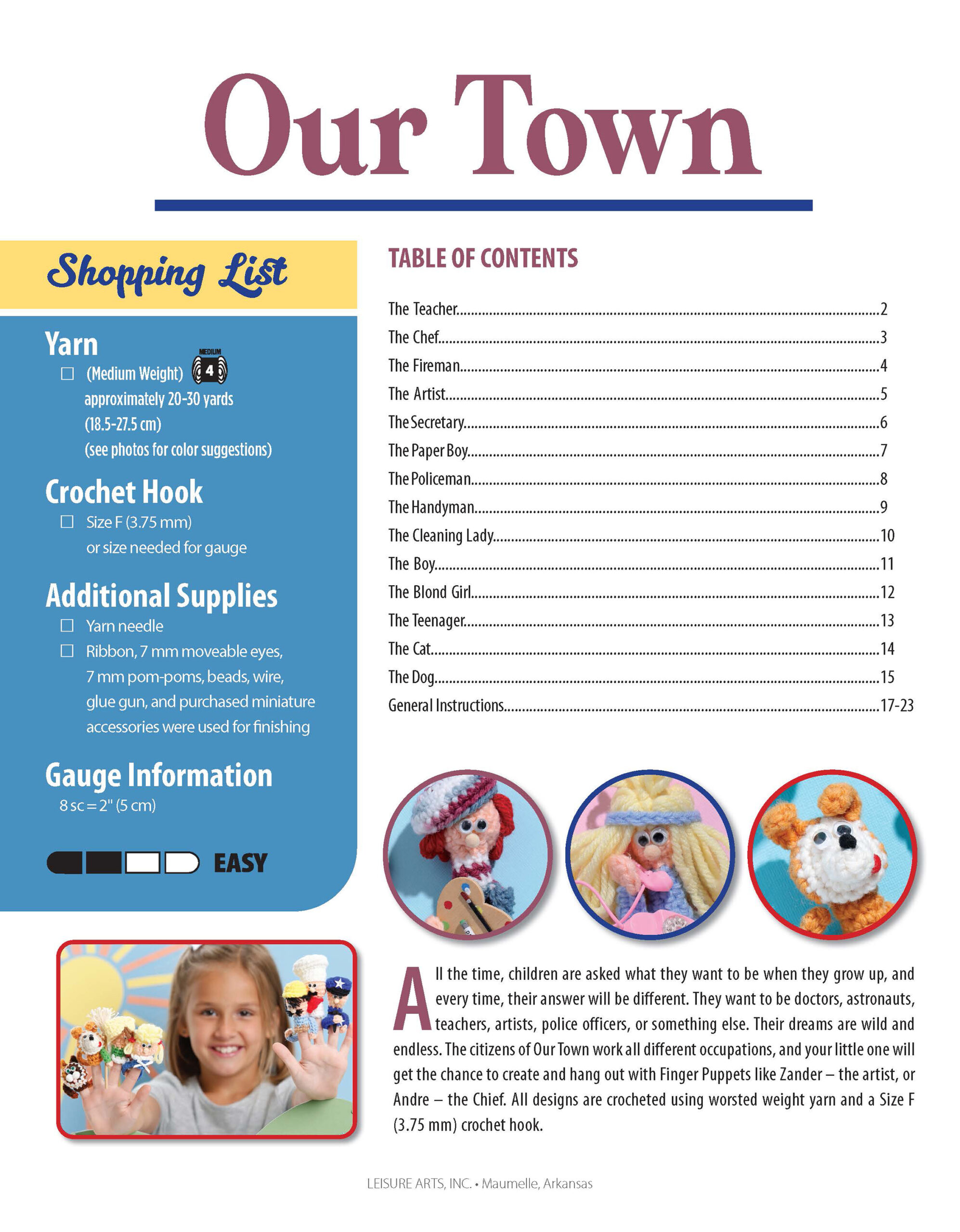 Finger Puppets Our Town- Do you like to visit grandma or grandpa, your aunts and uncles, or your friends? What are their every day jobs? Whatever it may be, they are loved ones who keep your town in order and moving forward. As you crochet these finger puppets, remember to love those people a little more with their own finger puppet. Occupations include: police, builder, artist, paper boy, and more. 24 pages, soft cover.