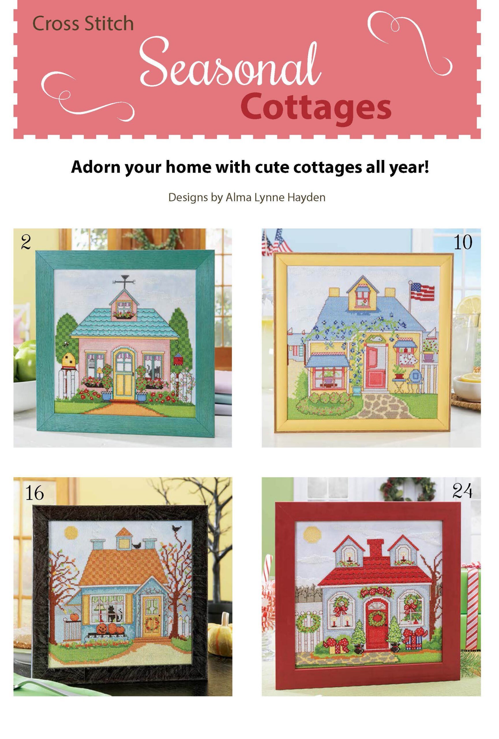 Herrschners Seasonal Cottages Cross Stitch- Decorate your home all year long with these charming cottages. Each delightful sample design is stitched on a soft blue, hand-dyed fabric resembling the sky to brighten up your home season after season. Scenic beauty reflects the changing seasons, while detailed diagrams and instructions make it easier than ever to cross stitch gorgeous pieces for your home. These intricate designs are recommended to be stitched on 25, 28 or 32 count fabric. Stitch counts measure approximately 125w x 125h. 32 pages, softcover.