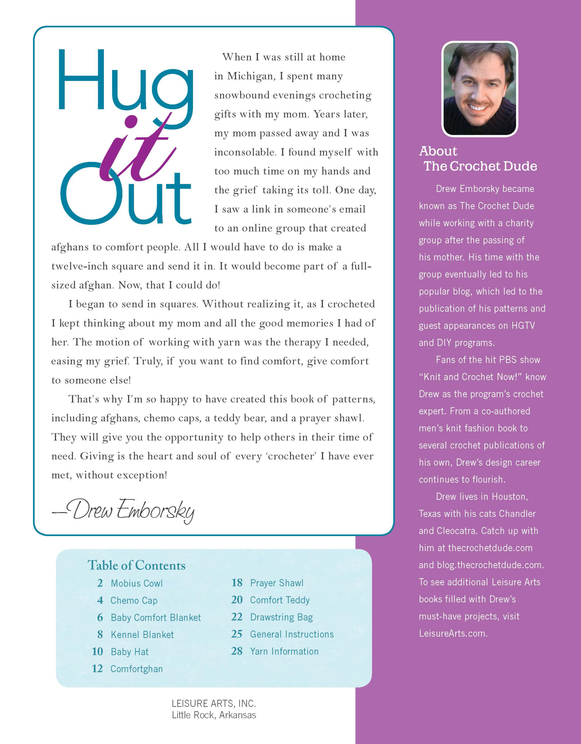 Hug It Out Crochet- 9 crochet designs to offer comfort. Crocheted with love, a warm wrap, or a plump teddy bear can be just the hug someone needs. The motion of stitching and working with yarn is wonderful therapy for the crocheter as well. Designs include mobius cowl, chemo cap, baby comfort blanket, kennel blanket, baby hat, comfortghan, prayer shawl, comfort teddy bear, and drawstring bag. Projects call for a wide variety of yarn weights and crochet hooks ranging between US sizes D-3 and K-10 1/2. Includes step-by-step instructions for each design, a general guide to crochet, and a contact list of national groups that distribute crocheted donations. Easy to Intermediate skill level. 28 pages in a softcover.
