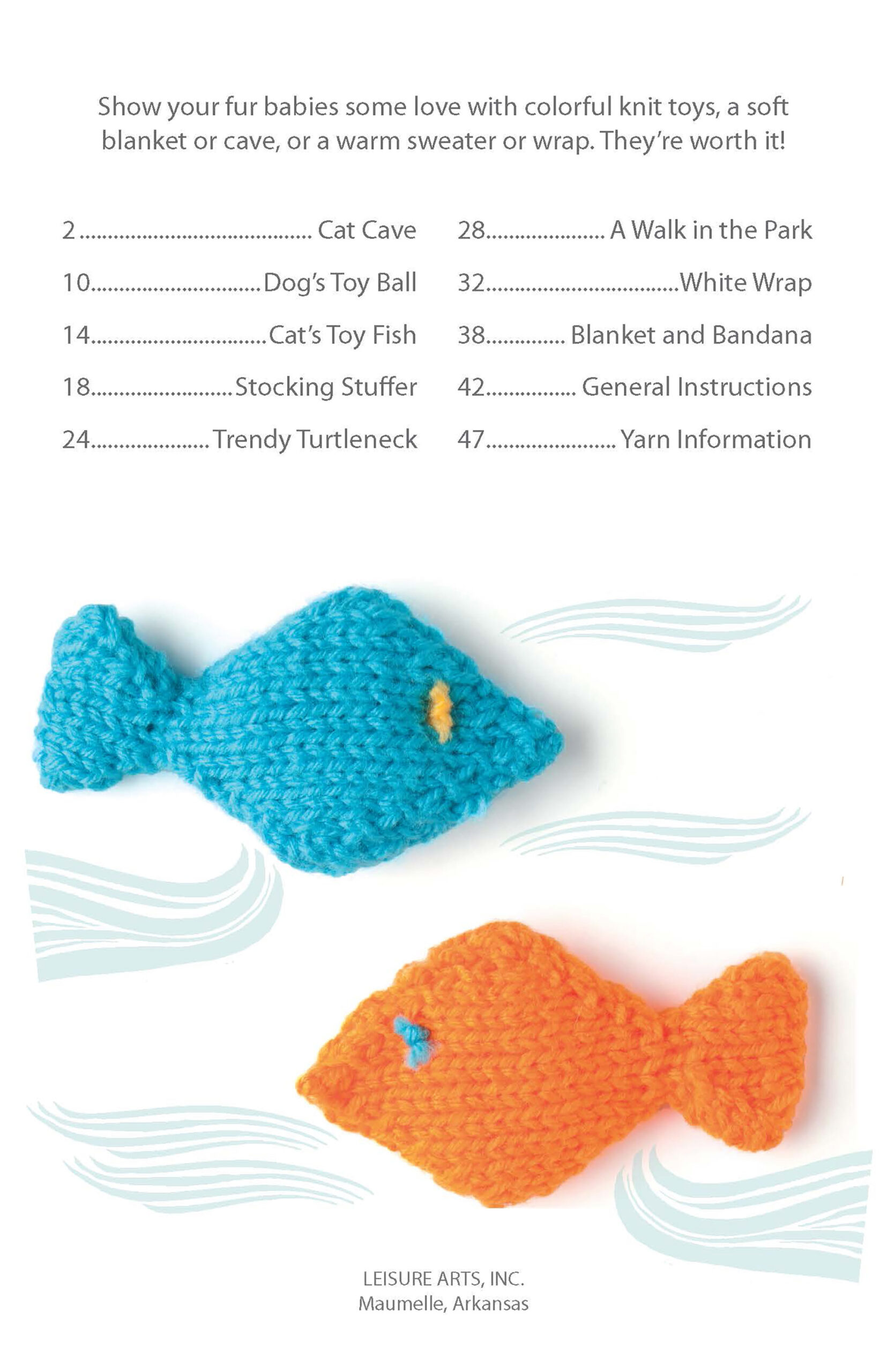 Knits For Pets- Indulge your dogs and cats with soft knits for snuggling, playing or just looking cute. 12 projects include shark mouth cat cave, toy ball in three sizes, toy fish, dog coats, turtleneck, wrap, blanket in three sizes and bandana in three sizes for necks 8″ to 24″. Projects are beginner to easy skill level. Uses a variety of yarn weights from size 4 medium to size 6 super bulky. All garment instructions are given in four sizes, for chests 12″ to 24″. 48 pages in a softcover.