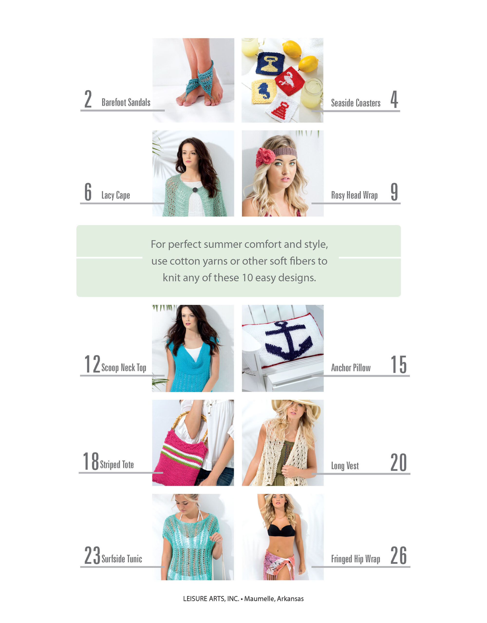 Knits For Summer- Be cool all summer with airy fashions and seaside accessories that are easy to knit. Using cotton yarns or other soft fibers to knit any of these 10 designs to achieve perfect summer style and comfort. Designs include: barefoot sandals, coasters, pillow, tote, and more. 32 pages, soft cover.