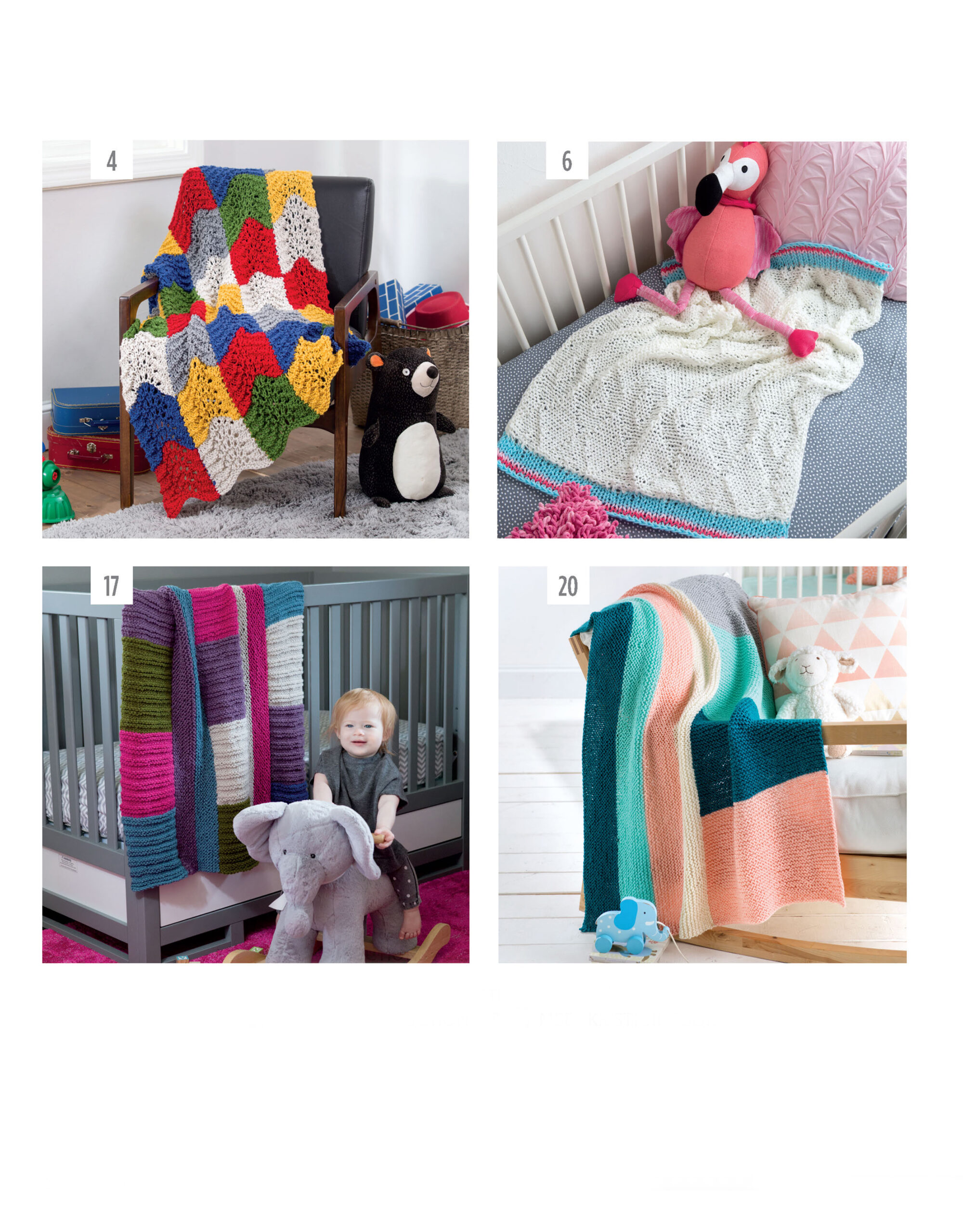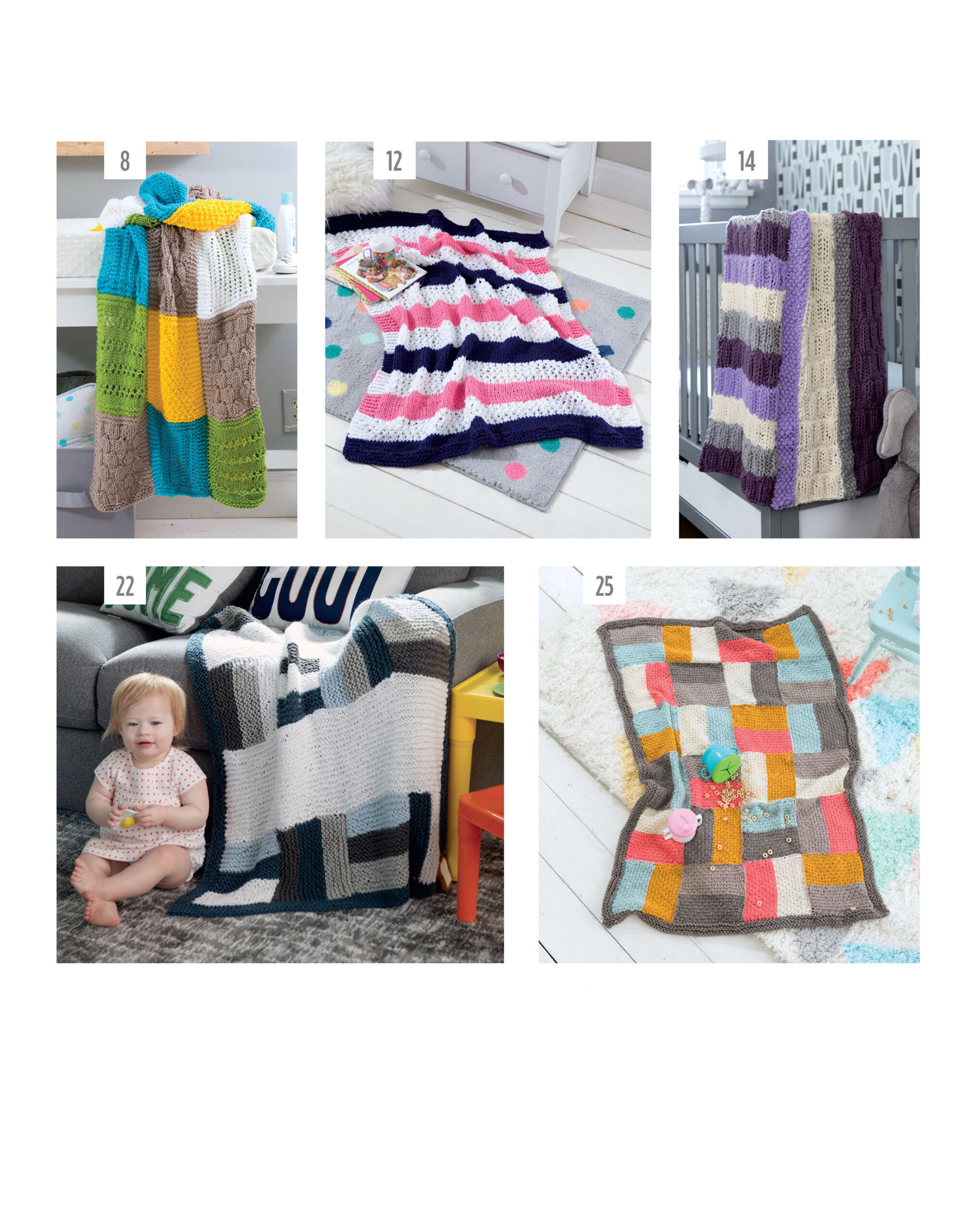 Knit Color Block Blankets- Colorful blocks and stripes combine with a mix of simple pattern stitches to create cute and easy baby blankets. Nine designs, by Kristi Simpson, are equally pleasing to the eye and the touch. Each is knit using easy skill level and medium weight yarn in a sequence of colors and textures. Designs include chevrons, diamonds, ribbed, stripes & blocks, tri-color blocks, two-color blocks, up & sideways stripes, and a stitch sampler. Sampler has four strips featuring five pattern stitches: lacy twist, ridged eyelet, ladder rings, petite bobbles, and moss stitch. 32 pages in a soft cover.