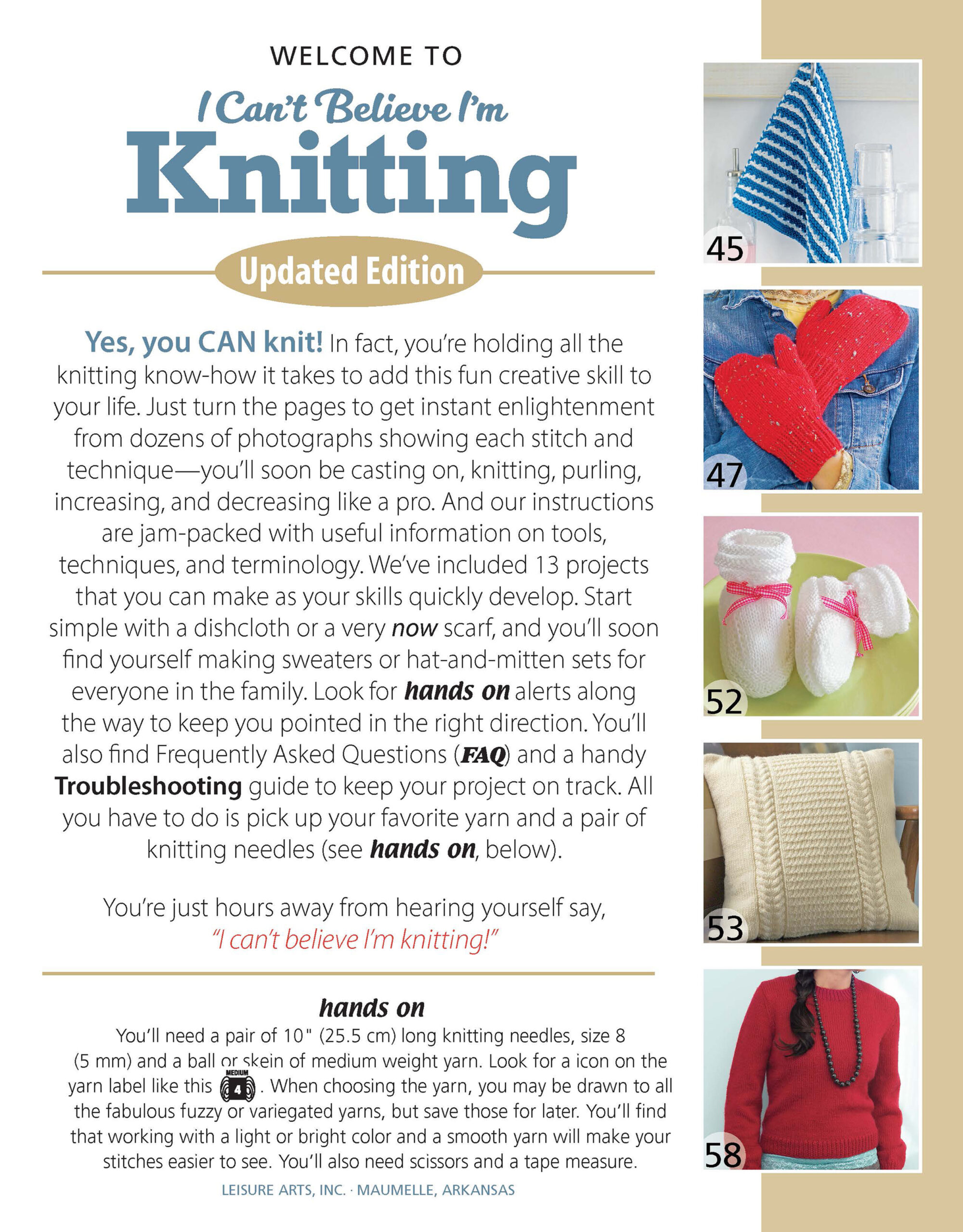 I Can’t Believe I’m Knitting- Learn how to knit. After mastering such knitting basics as casting on, increasing, decreasing, knit, and purl, you’ll soon be making your own creations. Color photos and step-by-step instructions guide you through knitting your own wearable accessories, thoughtful gifts, and decorative home accents. Uses a variety of yarn weights and needle sizes. 72 pages, soft cover.