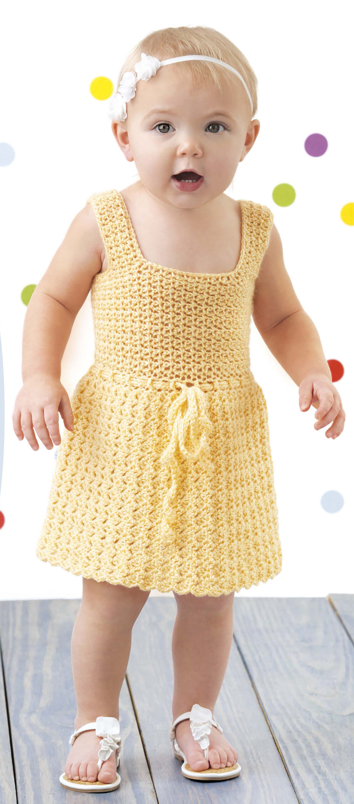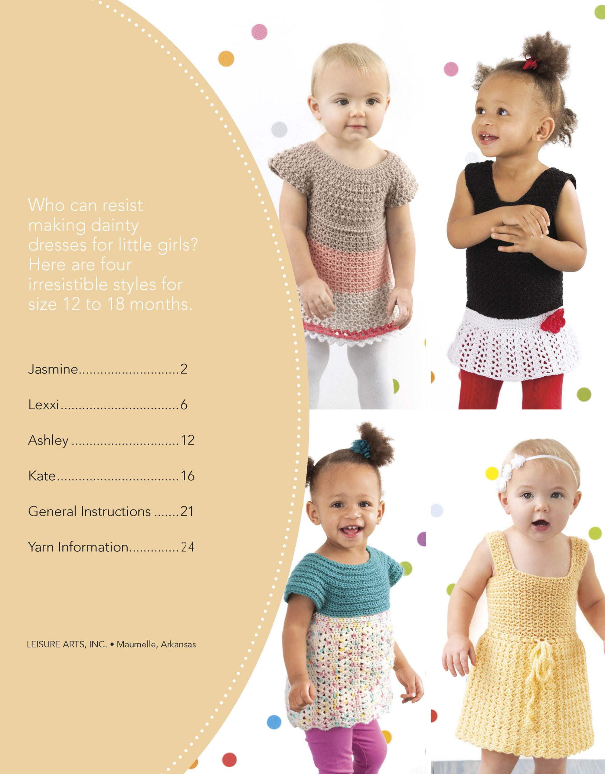 Lacy Little Girl Dresses Crochet- Dress them up in stylish lacy comfort. Sized for toddlers 12 to 18 months, these 4 designs are almost as sweet as your little one! Who can resist making these adorable dainty dresses for their little one? Designs include: circular yoke, full skirt, tiered stripes with lacy trim, and a dropped-waist dress with flower applique. These sweet toddler dresses are quick and easy to crochet in light weight yarn. 24 pages, soft cover.