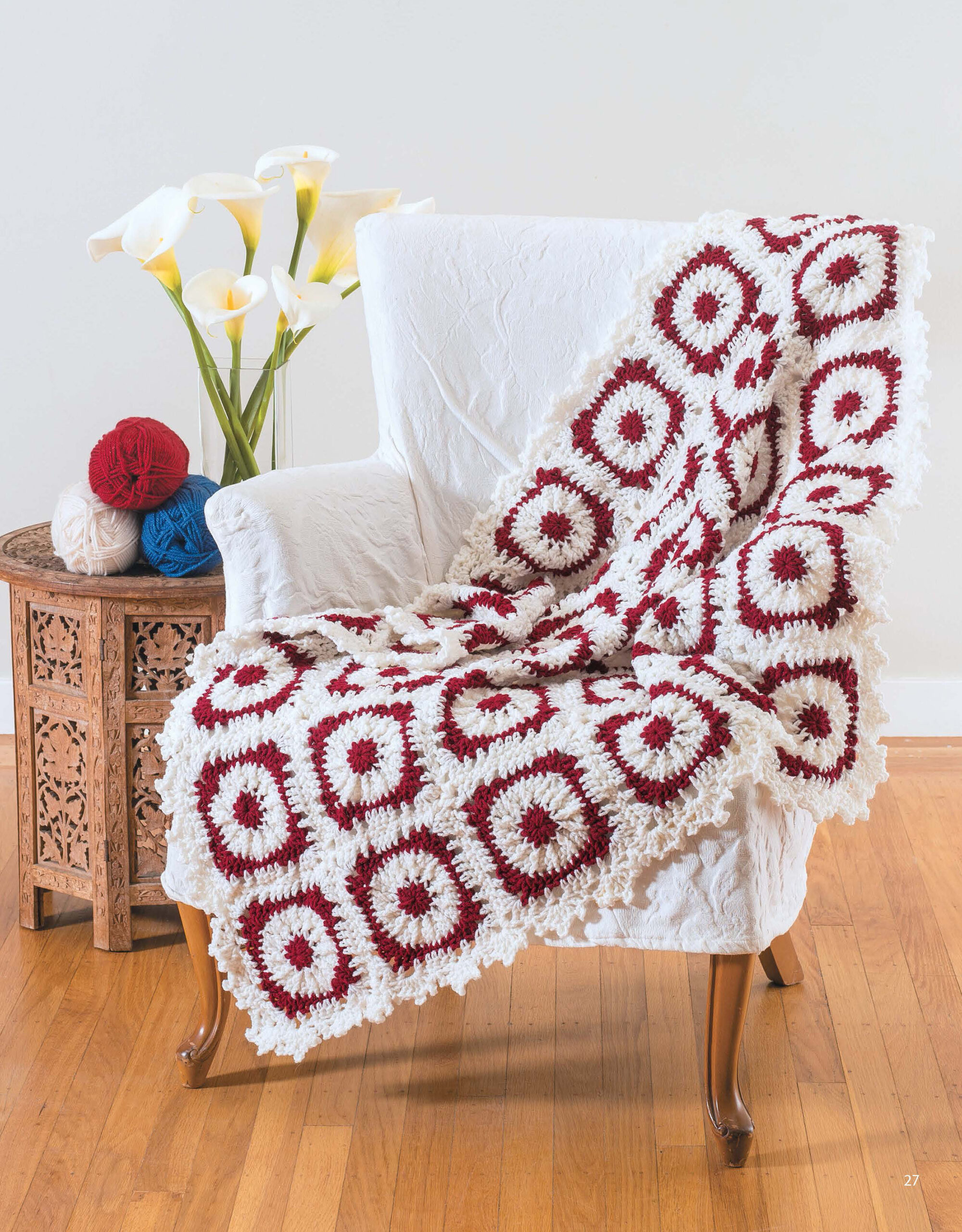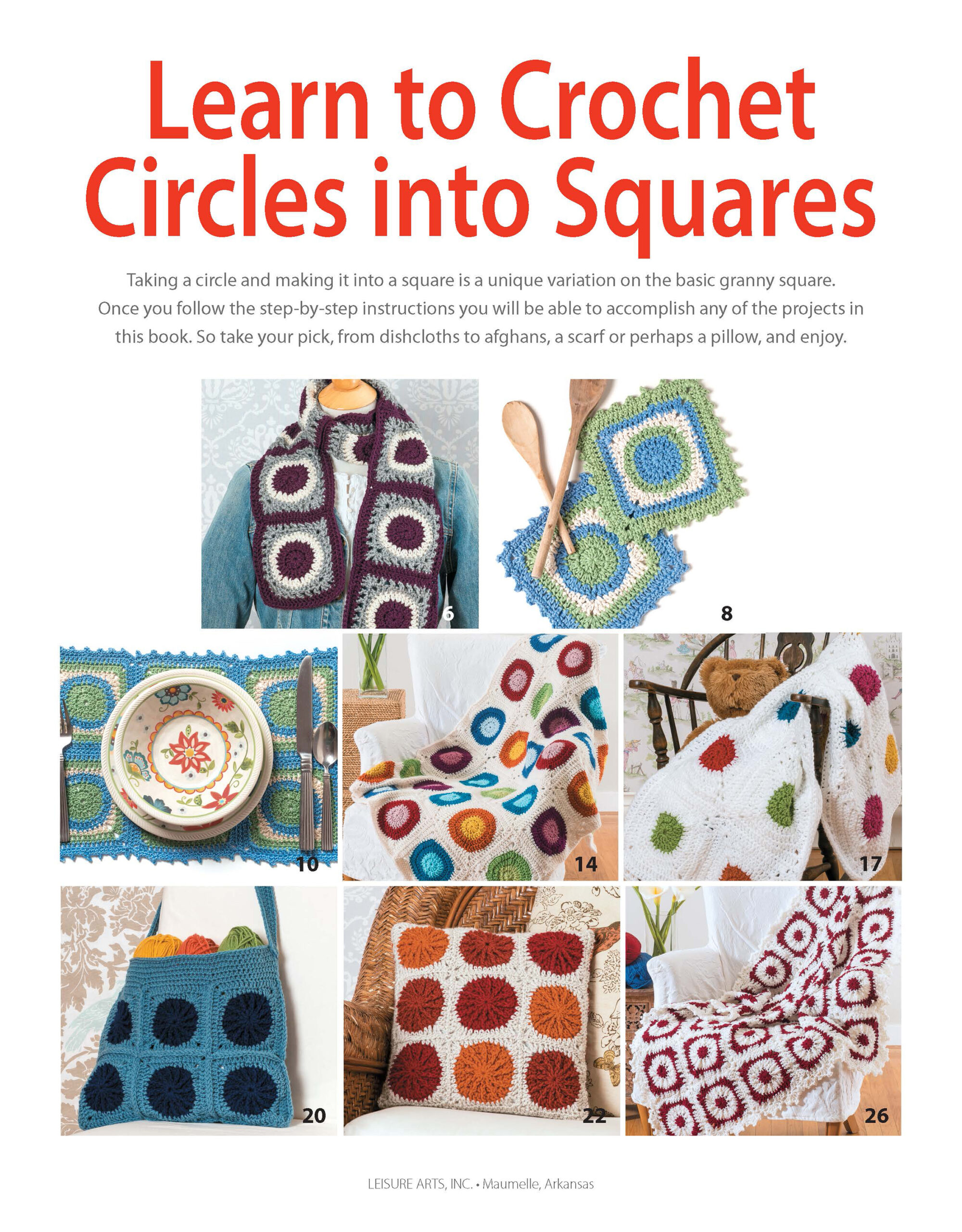 Learn To Crochet Circles Into Squares- Taking a circle and making it into a square is a unique variation on the basic crochet granny square. Once you follow the step-by-step instructions you will be able to accomplish any of the projects in this. So take your pick, from dishcloths to afghans, a scarf or a pillow, and enjoy. Projects call for size 2 fine and 4 worsted weight yarn and crochet hooks in US sizes F-5 and I-9. Includes detailed round by round instructions for each project. Easy skill level. 32 pages, softcover.