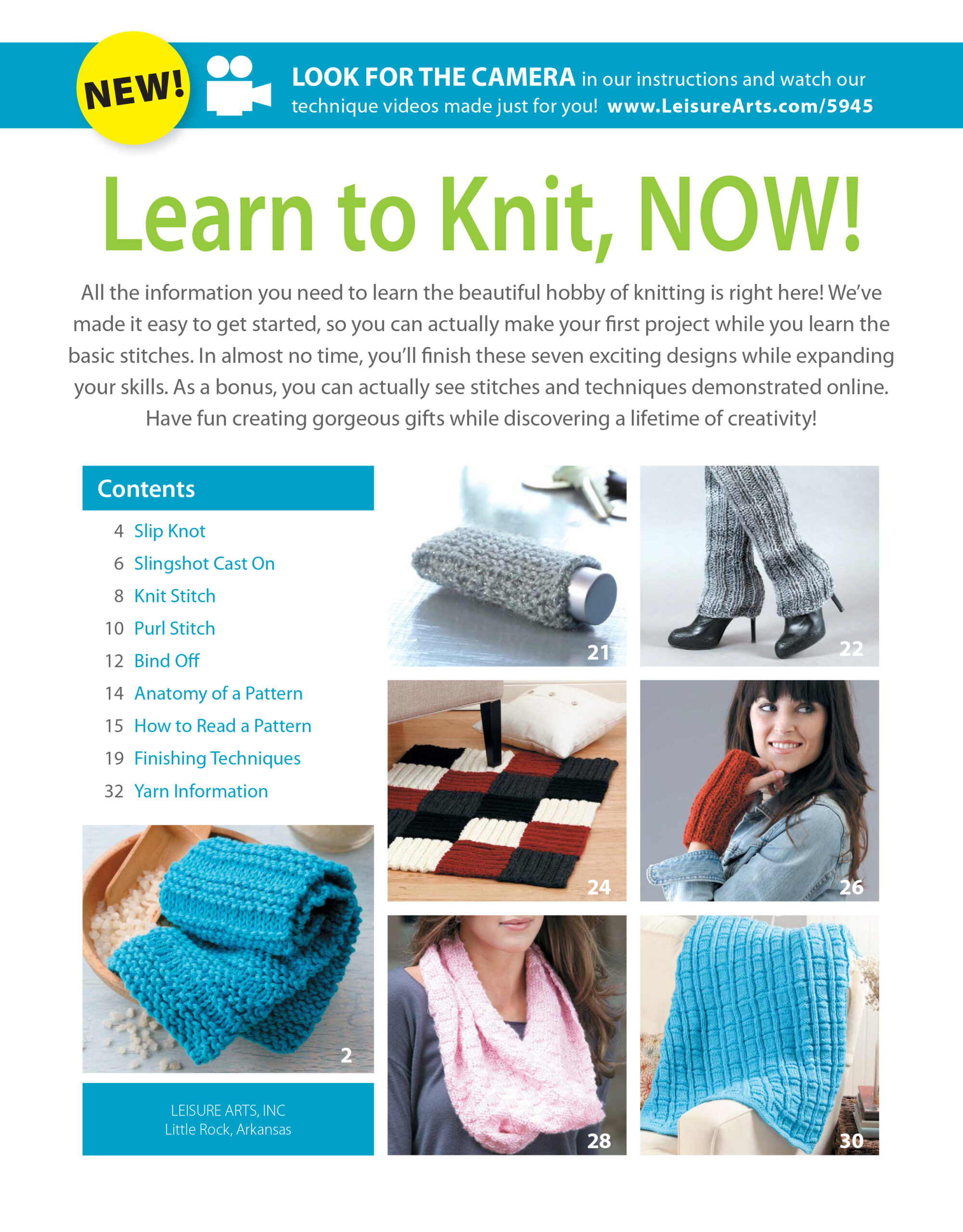 Learn To Knit Now- All the information you need to learn the beautiful hobby of knitting is right here. It’s easy to get started, so you can actually make your first project while you learn the basic stitches. In almost no time, you’ll finish these seven exciting designs while expanding your skills. Create gorgeous gifts including a spa cloth, lip balm cozy, leg warmers, wrist warmers, cowl, lap robe and rug. Projects can be made using size 2 fine, 4 worsted and 5 bulky weight yarn and straight knitting needles in US sizes 5, 8 and 11. Includes instructions on creating a slip knot, casting on, knit and purl stitches, binding off, reading patterns, finishing techniques and more with illustrated stitch diagrams. Beginner skill level. 34 page PDF download.