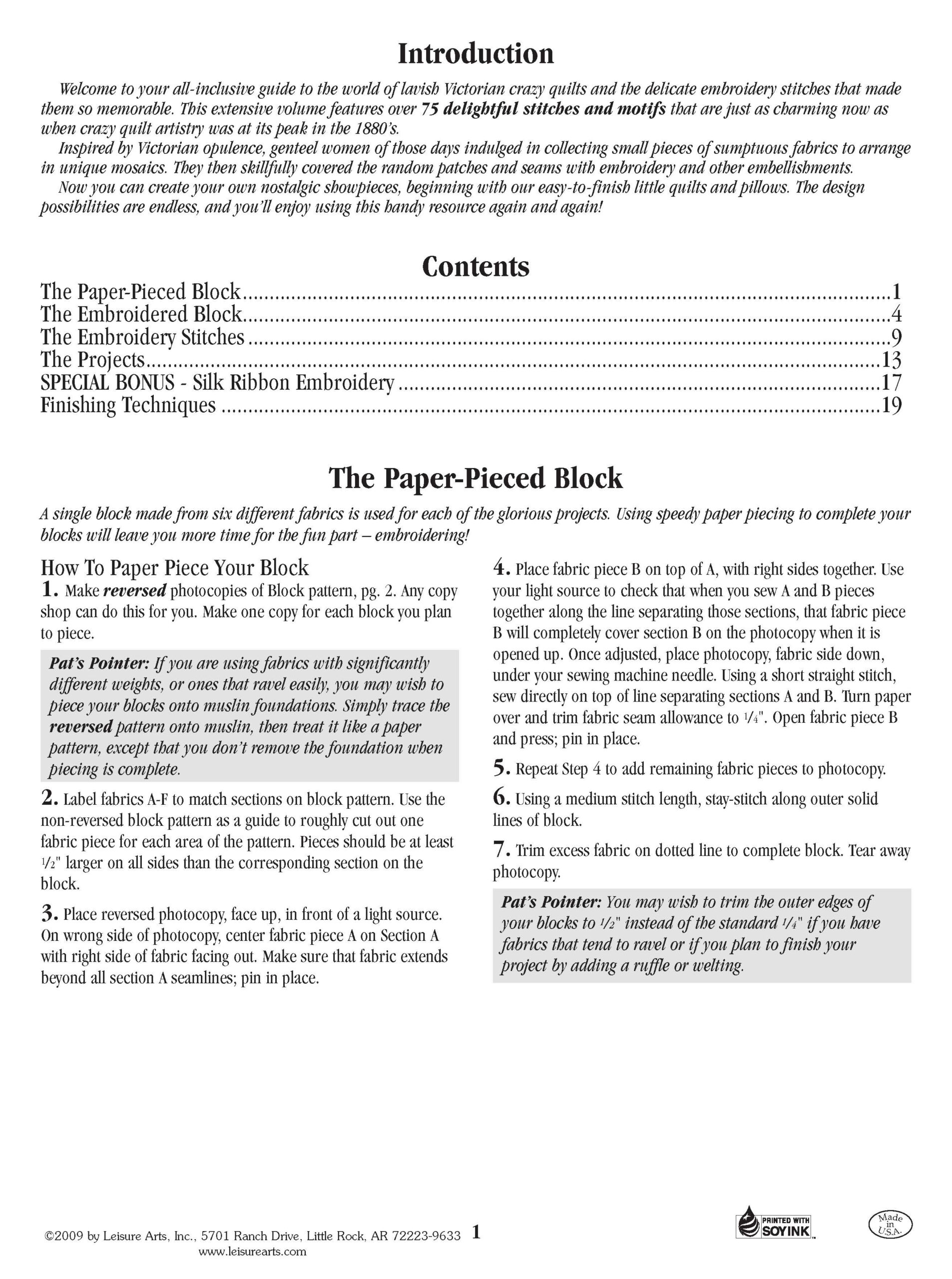 Leisure Arts Big Book Of Crazy Quilt Stitches Embroidery eBook- 75 delightful stitches and motifs to take your quilts to the next level. Inspired by historic quilting practices popularized in the 1880s, these designs combine random patches and seams with embroidery and other embellishments. Detailed guidebook includes information on paper-piecing and embroidery blocks, a wide variety of embroidery stitches with illustrated diagrams and silk ribbon embroidery. Projects include: precious purple pillow, ring bearer’s pillow, jewel-tone pillow, beautiful blue wall hanging, baby’s comforter and more. Beginner skill level. 22 pages, PDF download.