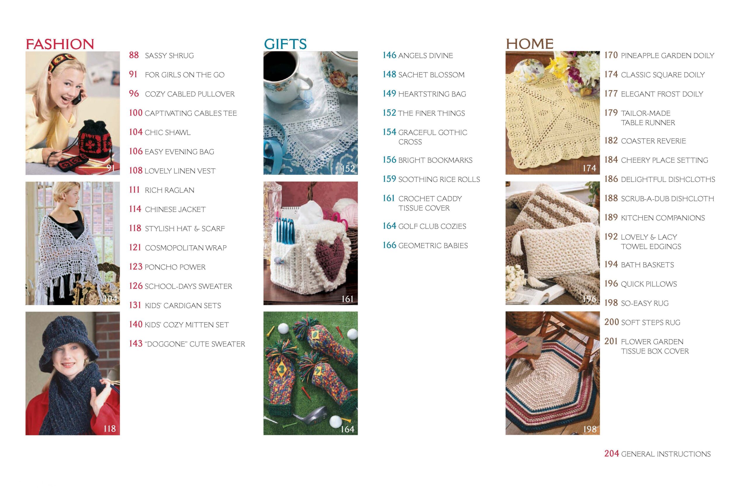 Leisure Arts Big Book Of Crochet eBook- Create over 120 crochet projects to wear, decorate your home or give as gifts. Sections include: afghans, baby, fashion, gifts, home and general instructions. Projects include: spider lace afghan, light and airy afghan, blue breeze afghan, cloud-soft layette, cutie-pie bubble suits, daisy blanket, sassy shrug, lovely linen vest, rich raglan, caster reverie, bath baskets, quick pillows and many more. Projects call for a wide variety of yarn weights and crochet hook sizes. East to intermediate skill level. 210 page PDF download.