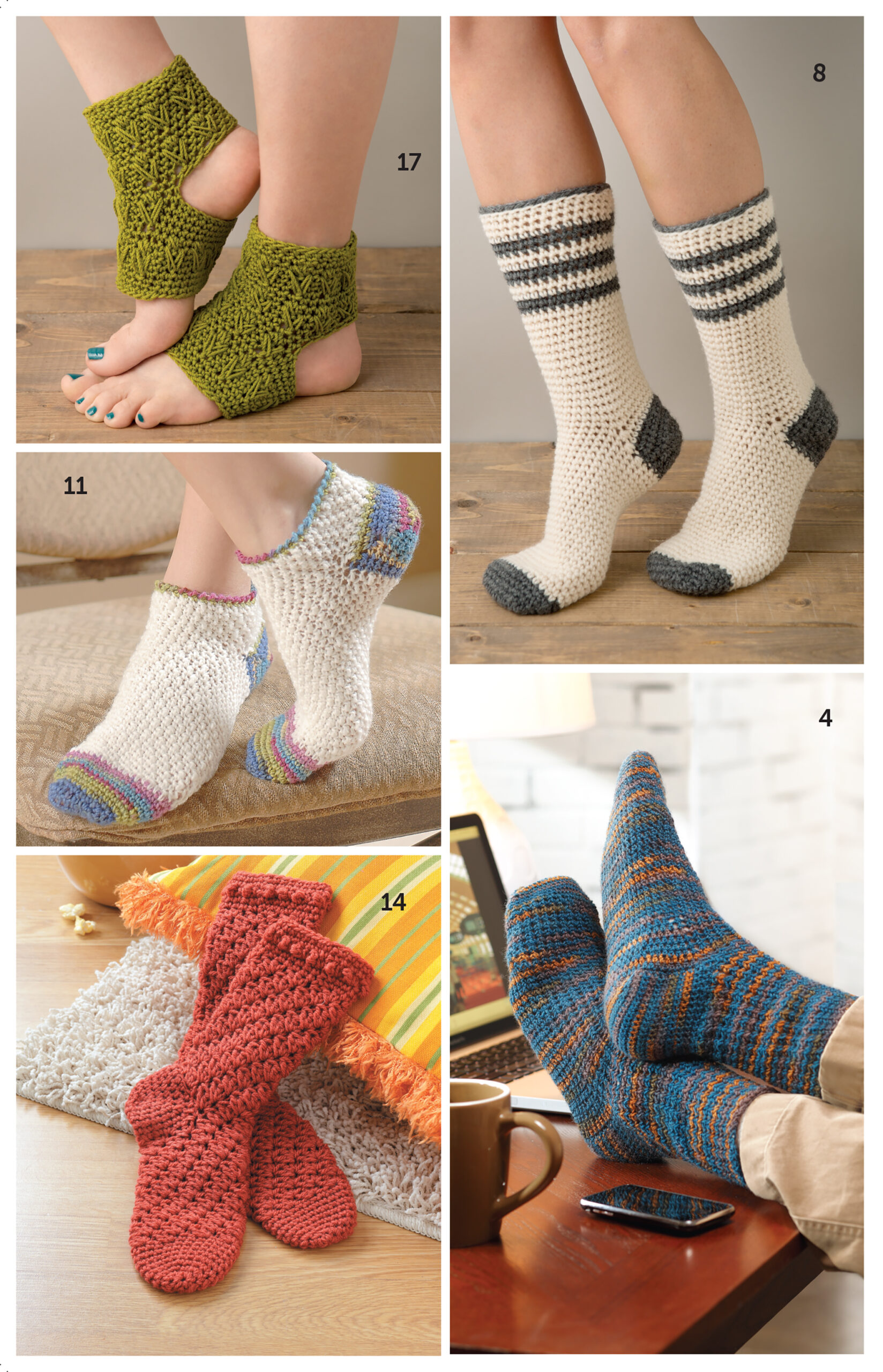 Leisure Arts Cozy Socks Crochet Pattern- 5 sock patterns perfect for the whole family. Designs include cobblestone socks, classic stripes socks, sport socks, diagonal shells and yoga socks. Projects can be made using size 1 super fine, 3 light and 4 worsted weight yarns and crochet hooks in US sizes E-4, F-5 and I-9. Includes round-by-round instructions, stitch guides, a general guide to crochet and multiple sizing options for each design. Easy to intermediate skill level. 24 page, softcover, pocket sized booklet.