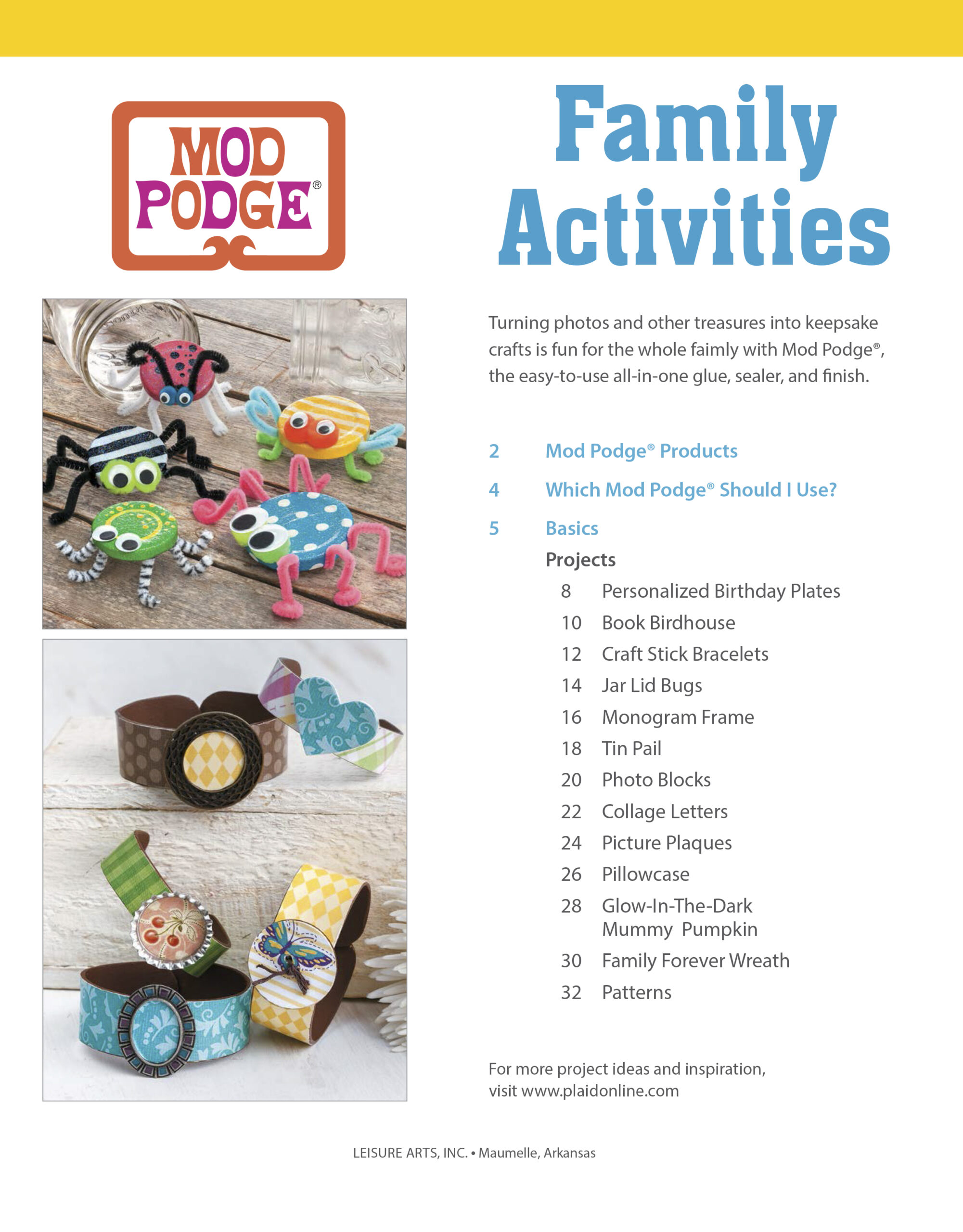 Leisure Arts Craft Books Mod Podge Family Activities Book- Easy projects to craft together. Mod Podge products make it easy for all ages to create fun home accessories and gifts. Turning photos and other treasures into keepsake crafts is fun for the whole family with Mod Podge, the easy to use, all in one glue, sealer and finish. This book contains twelve projects and a variety of patterns that include birthday plates, book birdhouse, jar lid bugs, pillowcase, and more. Included is a description of Mod Podge products and a graph of what should be used for specific projects. 32 pages in a soft cover.