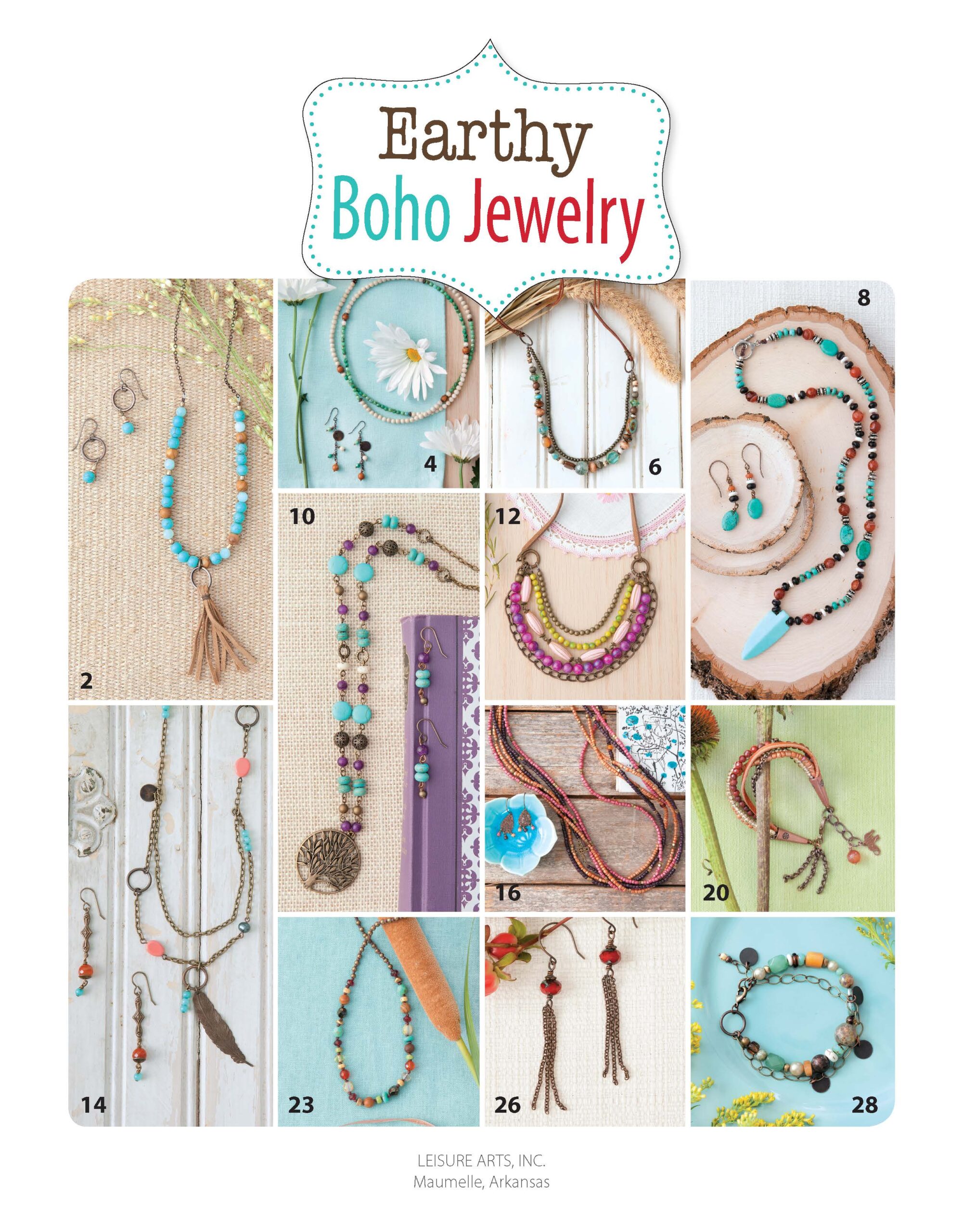 Leisure Arts Earthy Boho Jewelry eBook- Capture modern hippie allure with casual layers. Set your Bohemian soul free with handmade jewelry that gets its rich look from layers of earthy metals, stone beads, and leather. Choose from wild child earrings, midnight desert bracelet, tree of life necklace, and more. 34 pages, PDF download.