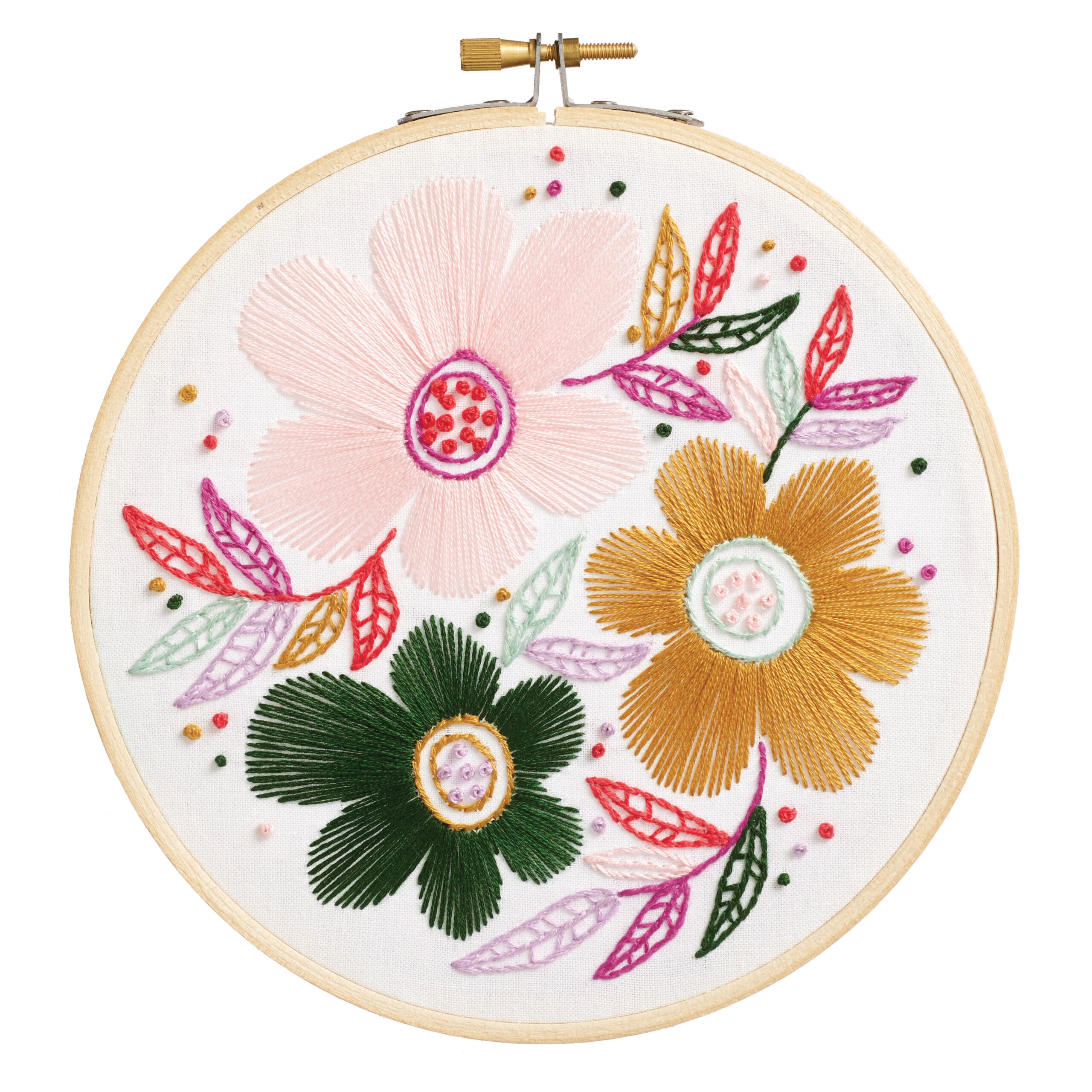 Embroidery kits typically include a 6-inch wooden embroidery hoop, embroidery floss, pre-printed or plain fabric, a needle, and step-by-step instructions created by the experts at Leisure Arts. The hoop helps keep the fabric taut while stitching and can also be used to display the finished piece. Designed to create one finished design, these kits are suitable for a range of skill levels. Colors and contents may vary.