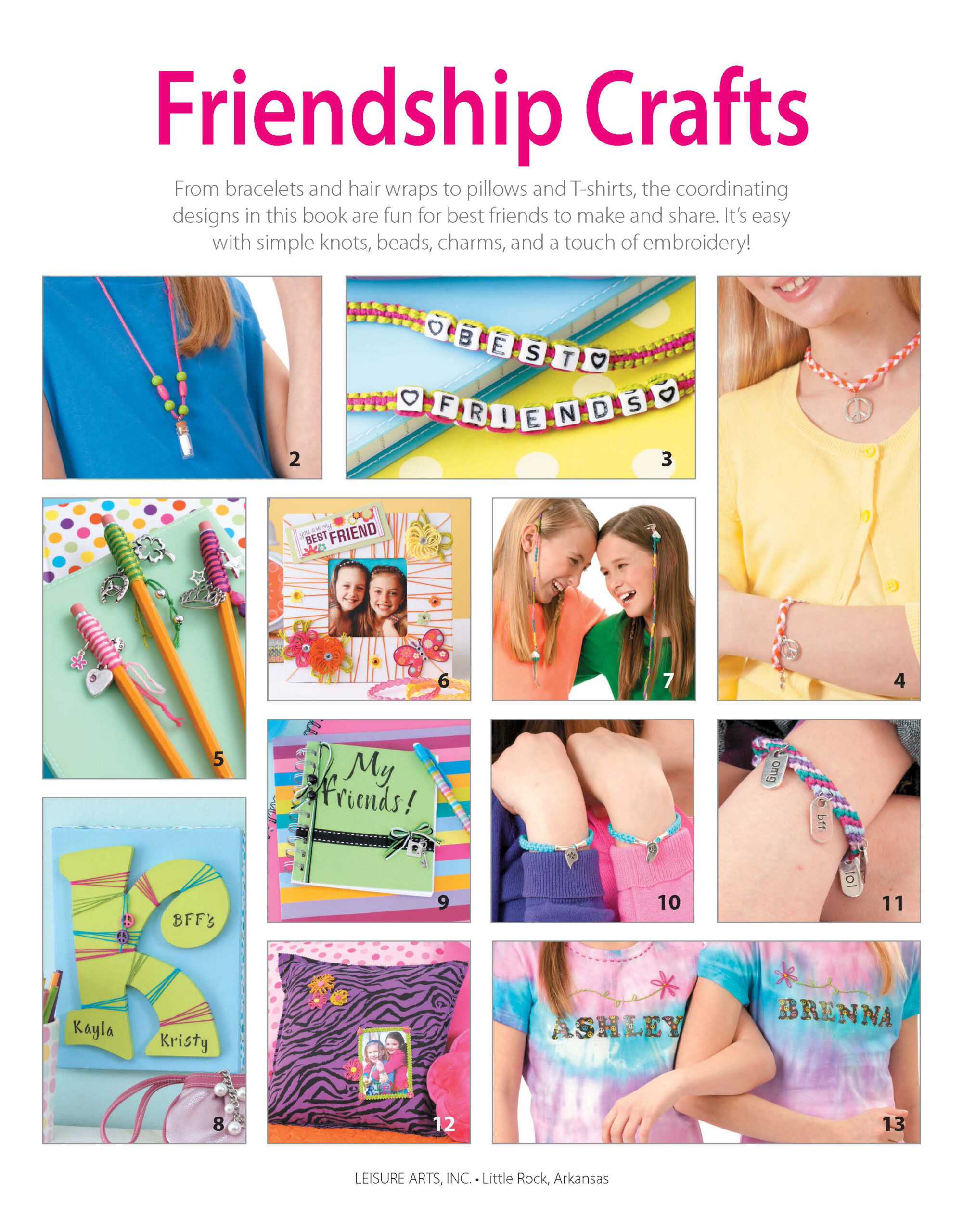 Leisure Arts Friendship Crafts eBook- The perfect projects for teens and tweens to make and share with their BFFs. From fashion accessories to home décor these cool designs will help you celebrate your friendship with fun projects to make together or give as gifts. Projects include: hair wraps, bracelets, frames, monogram wall hanging, photo books, pillows, t-shirts and more. Includes step-by-step instructions, diagrams and inspirational design photos for each project. Easy skill level. 18 pages, PDF download.