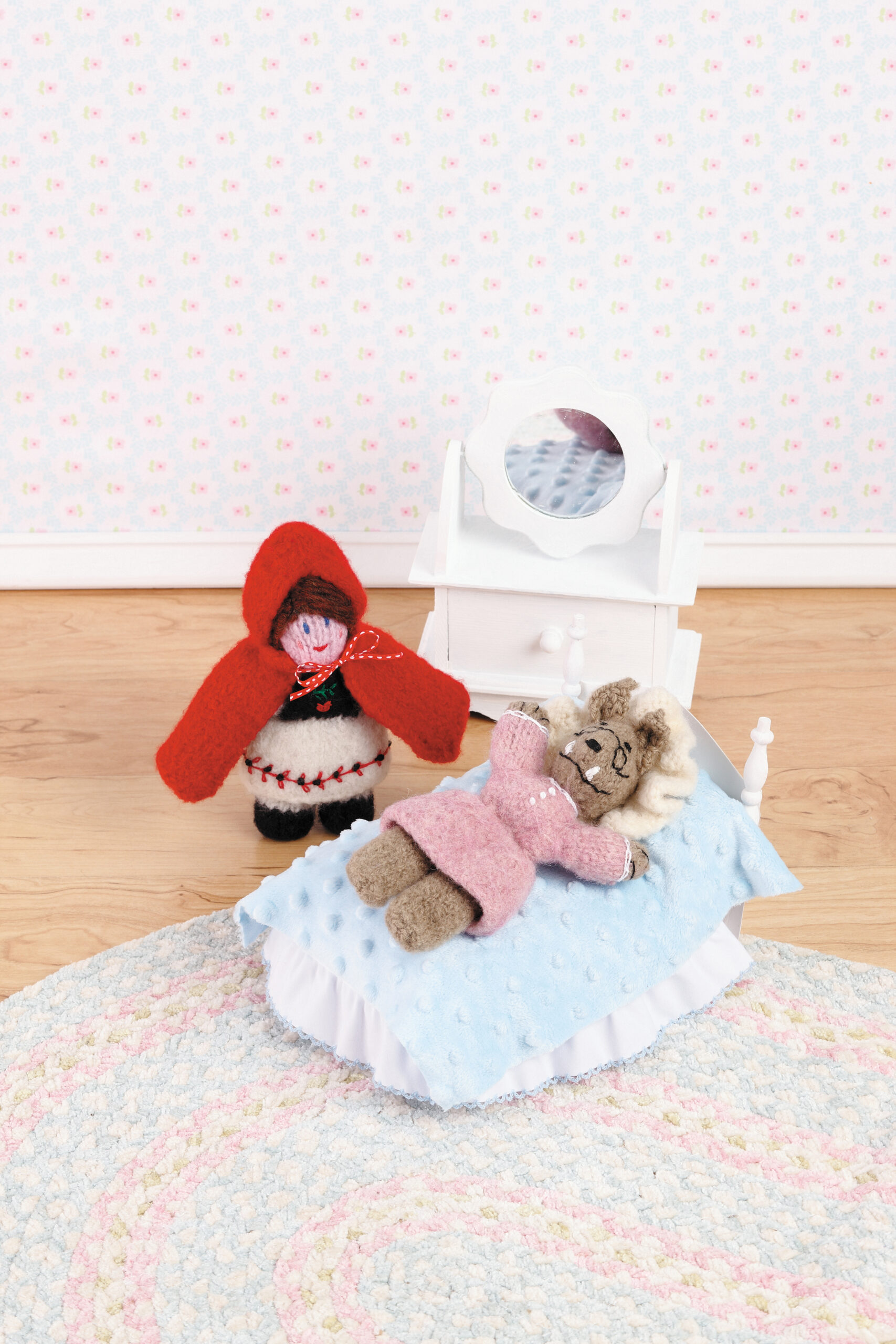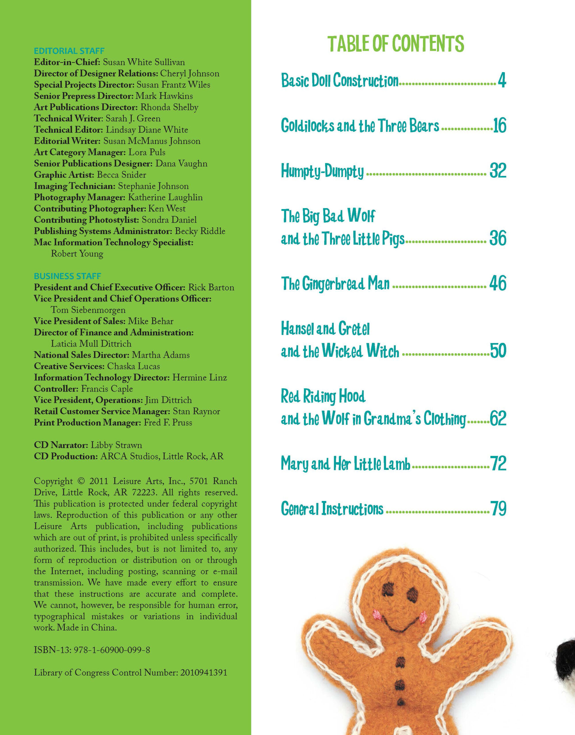 Leisure Arts Storybook Dolls to Knit eBook- Classic fairytales come to life when children slip the legs of these Walkabout Puppets onto their fingers. 13 character designs include: Goldilocks and the three bears, Humpty-Dumpty, the big bad wolf, three little pigs, gingerbread man, Hansel and Gretel, wicked witch and more. Each character can be made using a commination of size 1 super fine, 3 light and 4 worsted weight yarn and double pointed knitting needles in US sizes 3 and 8. Includes detailed, full-color instructions on creating the basic body shapes, plus step-by-step instructions for each doll design. Finished puppets measure between approximately 6″ and 9″ tall. Intermediate skill level. 83 pages, PDF download.
