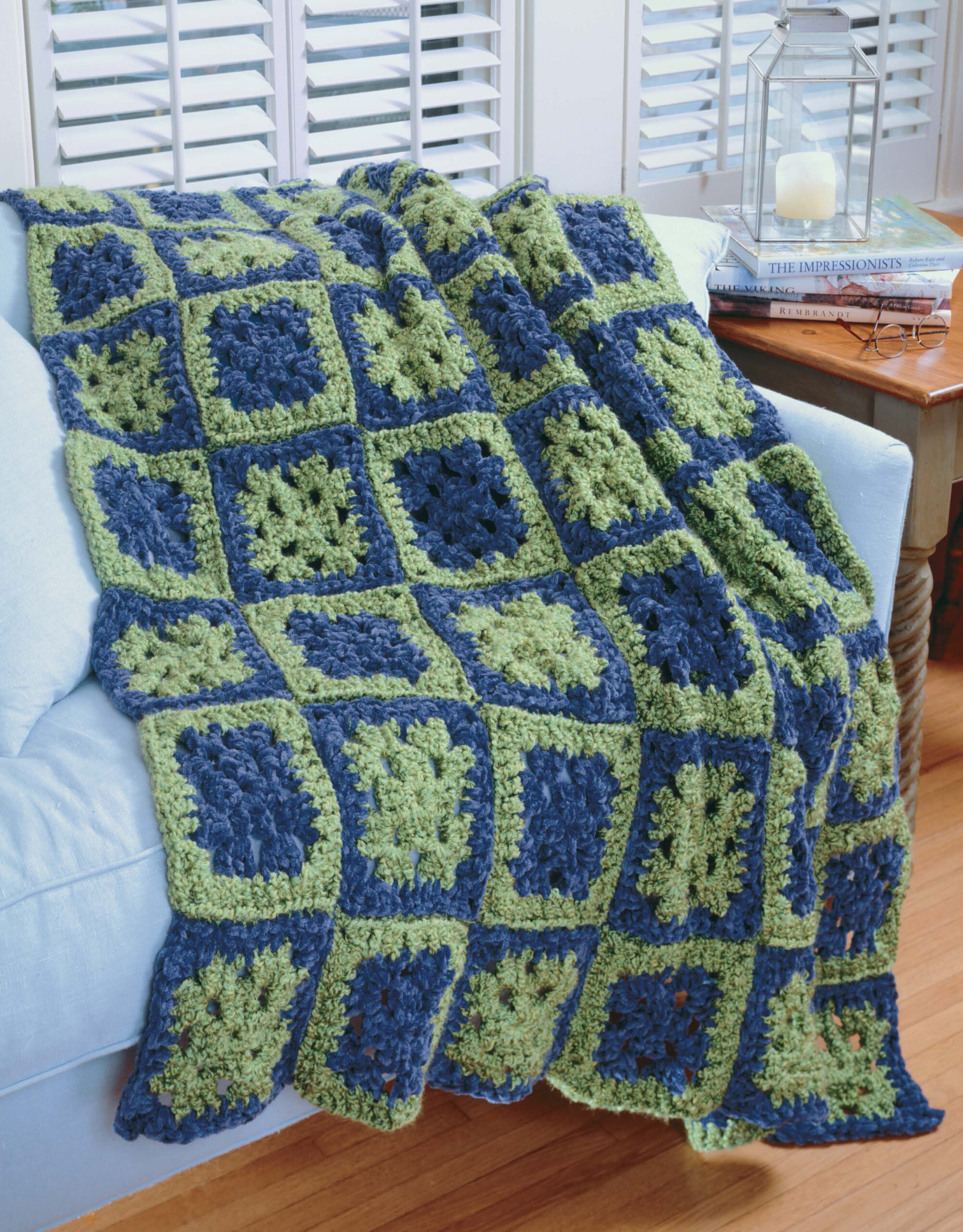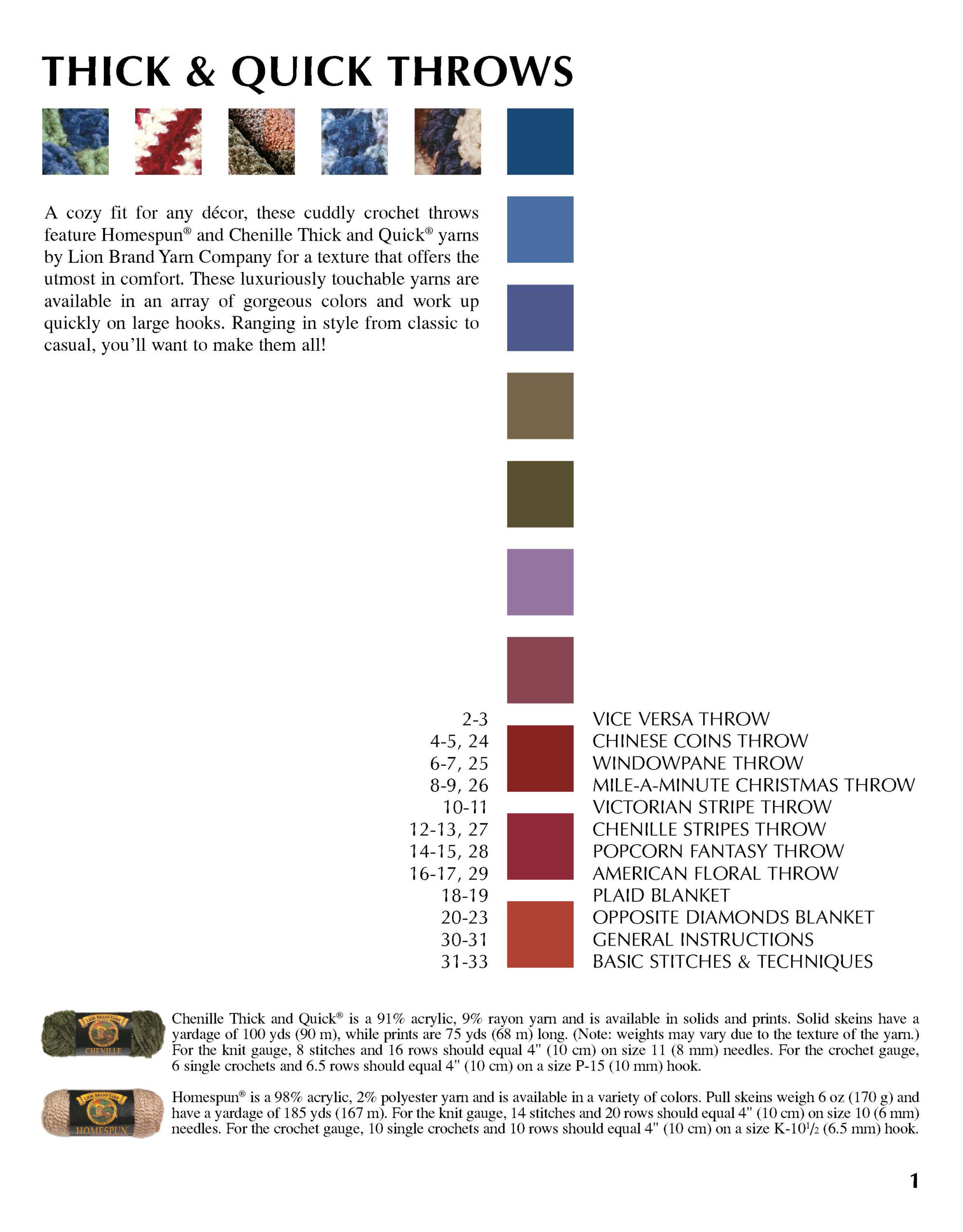 Leisure Arts Thick & Quick Throws Crochet eBook- A cozy fit for any décor, these cuddly crochet throws feature Lion Brand Homespun and Chenille Thick and Quick yarns in an array of gorgeous colors. Ranging in style from classic to casual, you’ll want to make them all. 10 designs include: vice versa, Chinese coins, windowpane, mile-a-minute Christmas, Victorian stripe, chenille stripes, popcorn fantasy, American floral, plaid blanket and opposite diamond. Projects call for size 5 bulky and 6 super bulky weight yarns, and a US size P-15, 10mm, crochet hook. Includes step-by-step instructions for each design. Finished afghans measure between approximately 37 1/2″x 52 1/2″ and 55″x 60″. Easy to intermediate skill level. 35 pages, PDF download.