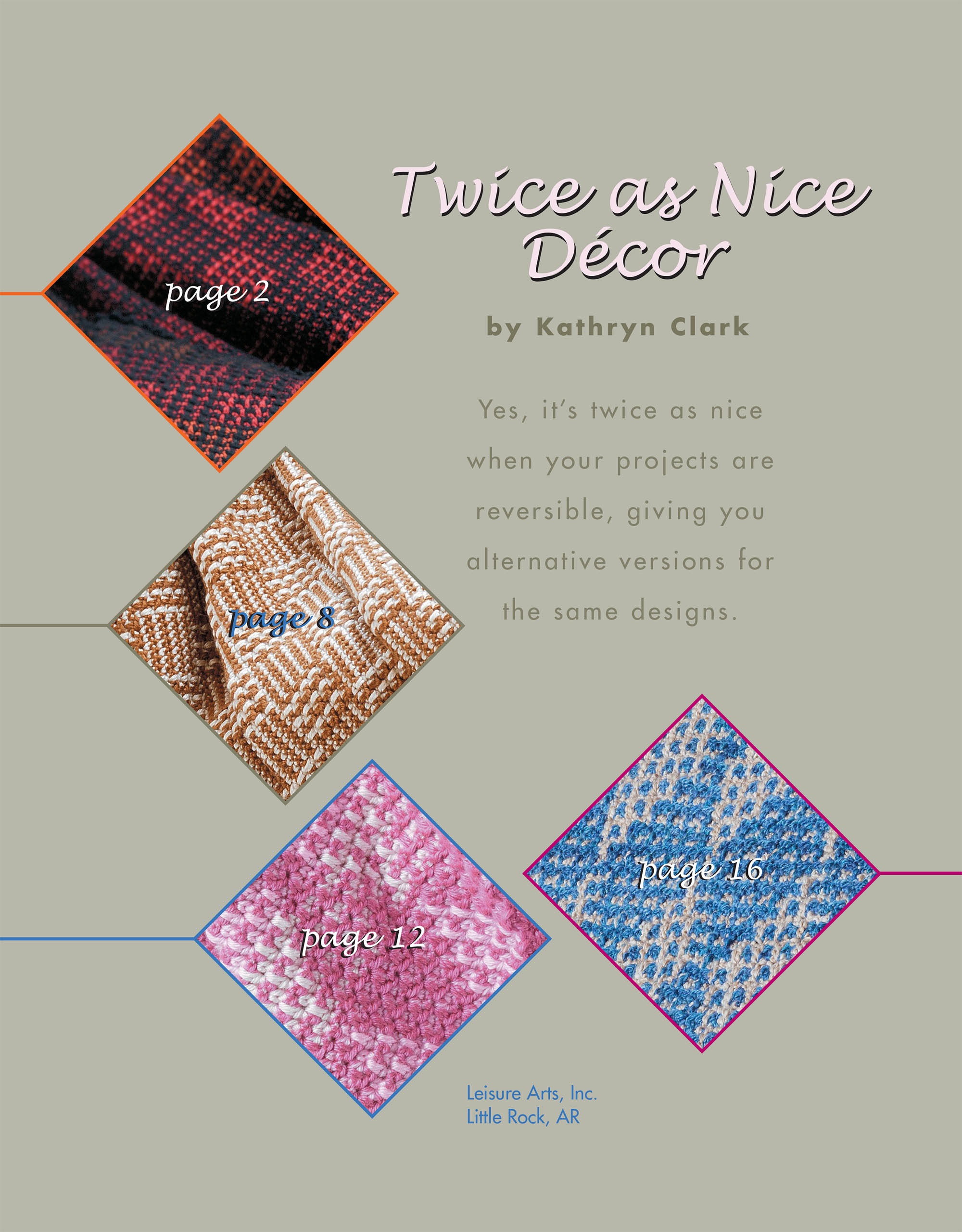 Leisure Arts Twice As Nice Décor Crochet eBook- It’s twice as nice when your projects are reversible, giving you alternative versions for the same design. All use 4 medium and 5 bulky weight yarns; size H, 5mm; I, 5.5mm; and N, 9mm hooks. 26 page PDF download.