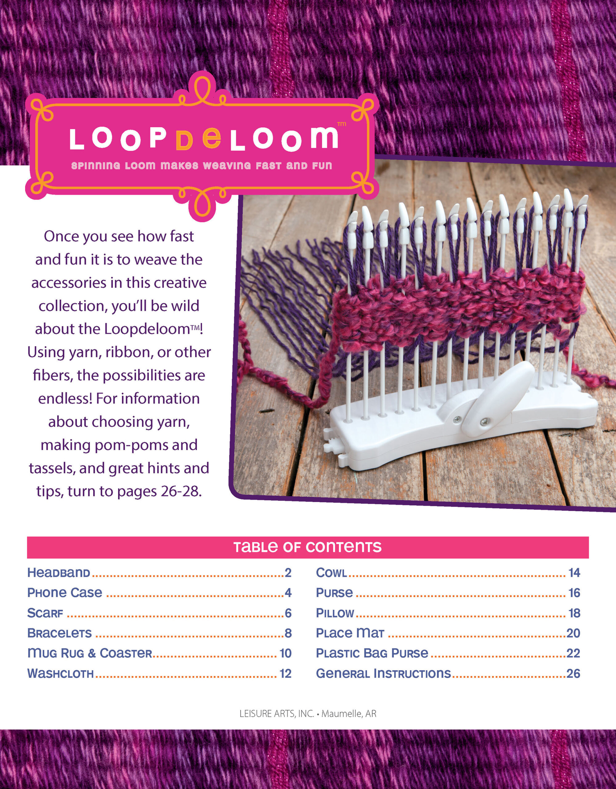LoopdeLoom The Dream Weaver- The Loopdeloom spinning loom makes weaving fast and fun. Make anything from headbands to purses to cowls, bracelets, phone cases, and more. Follow along with the yarn examples, or get creative with embroidery floss, ribbon, or anything you can weave. Designs include: placemat, pillow, scarf, coaster, washcloth, and more. Projects call for size 4 worsted, 5 bulky, and 6 super bulky weight yarns. Includes step-by-step instructions for each design, plus diagrams and tips on using the LoopdeLoom tool. Wearable projects are designed to fit teens and tweens. Great for any skill level. 28 pages, softcover.