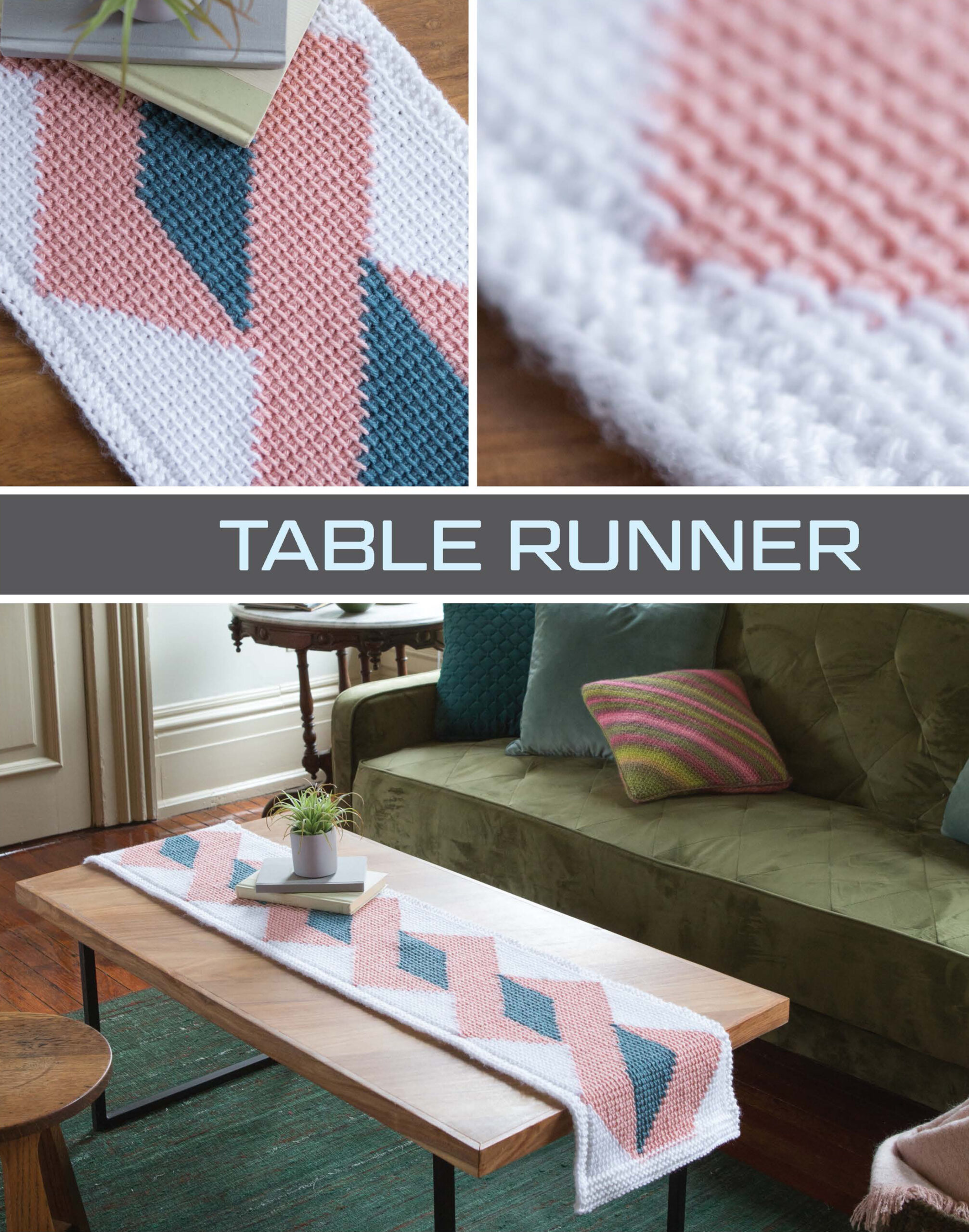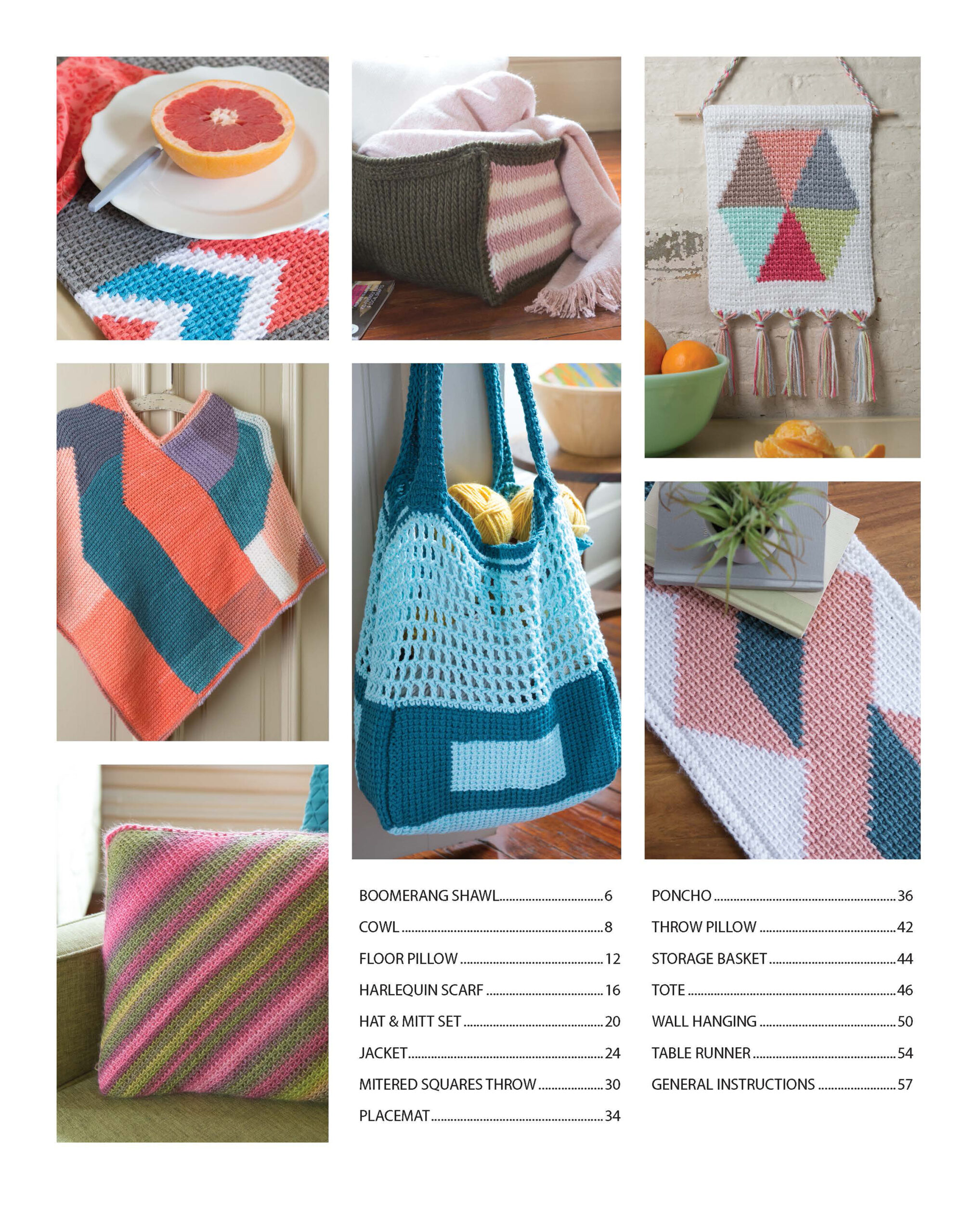 Crochet Modern Tunisian- 15 easy crochet projects along with technique tips and tricks. These beginner level everyday items provide step-by-step instructions with pictures and supply lists to help you create these Tunisian inspired projects. Pick from: boomerang shawl, cowl, floor pillow, harlequin scarf, hat and mitt set, jacket, mitered squares throw, placemat, poncho, throw pillow, table runner, and more. 64 pages, softcover.