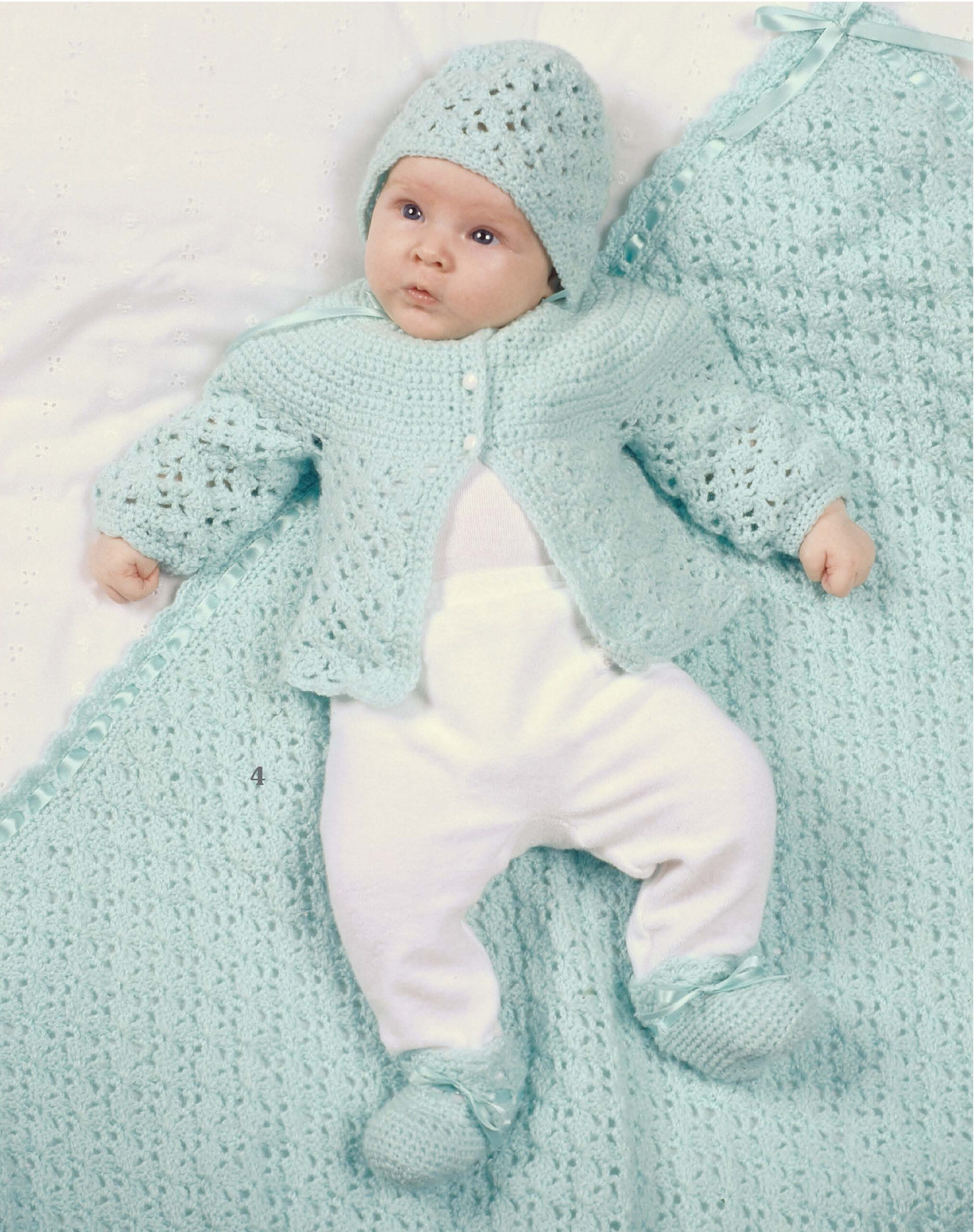 My Very First Layette- Four Sets to Crochet. Perfect for newborns, these precious sets feature outfits and blankets just right for showing off baby to family and friends. Designer details give the sets heirloom quality. Each easy-to-stitch sweater or sacque, cap or bonnet, afghan, and bootie set will please baby and mother alike. Choose from four styles in lightweight yarn for girls and boys in size newborn to 3 months. All use US size F crochet hook. 20 pages in a softcover.