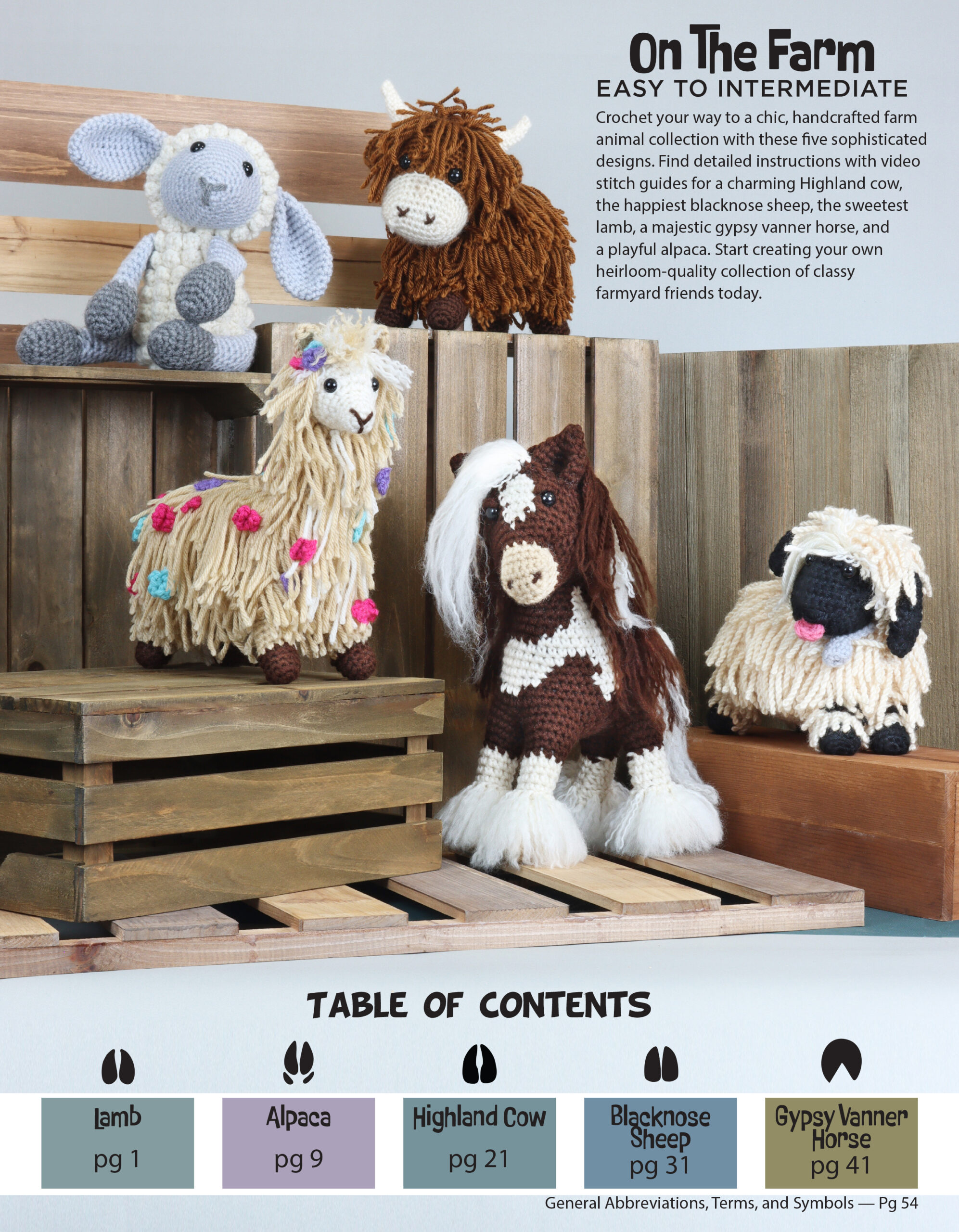 Leisure Arts On The Farm Crochet Book- Stitch Your Way Through the Cutest Countryside Companions! Welcome to the farm, where soft yarn meets charming animals! On the Farm features 5 adorable crochet amigurumi patterns inspired by life in the countryside: the Valais Blacknose Sheep, Alpaca, Gypsy Vanner Horse, Highland Cow, and a sweet little Lamb. Each animal brings its own charm and personality, so whether you’re new to amigurumi or looking to grow your handmade herd, these lovable farm animals invite you to slow down, stitch by stitch, and enjoy the simple pleasures of crocheting and bring the farm to life—one adorable animal at a time.