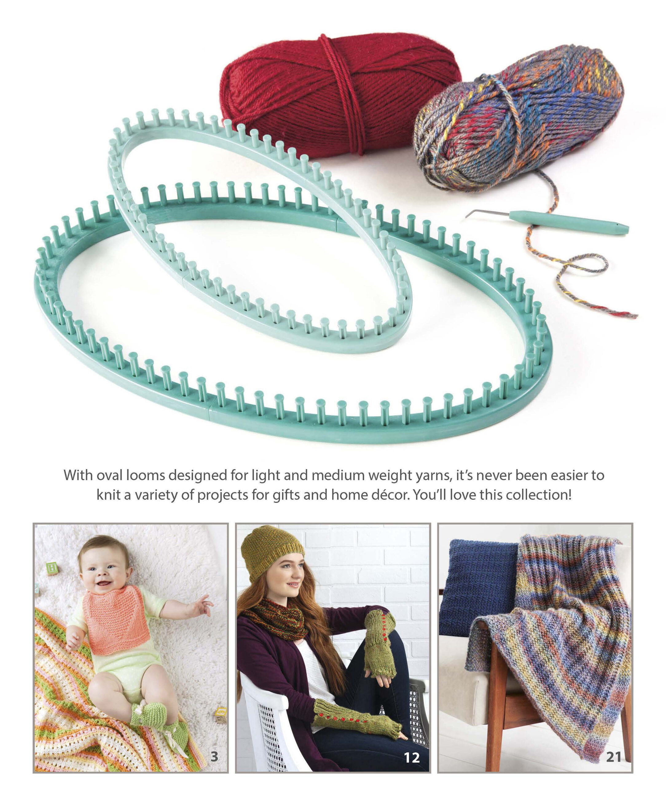 Oval Loom Knit Collection- Get ready to love the oval loom. You can use lighter yarns to create adorable baby designs, lovely winter fashions, and cozy home accessories. These designs use light or medium weight yarns, and are for beginner t intermediate skill level. Designs include: heart baby bib, lacy stripes baby blanket, garter checks cowl, leisure time pillow, and more. General instructions for knitting on a loom are given and include detailed photos of each step. 32 pages in a soft cover.