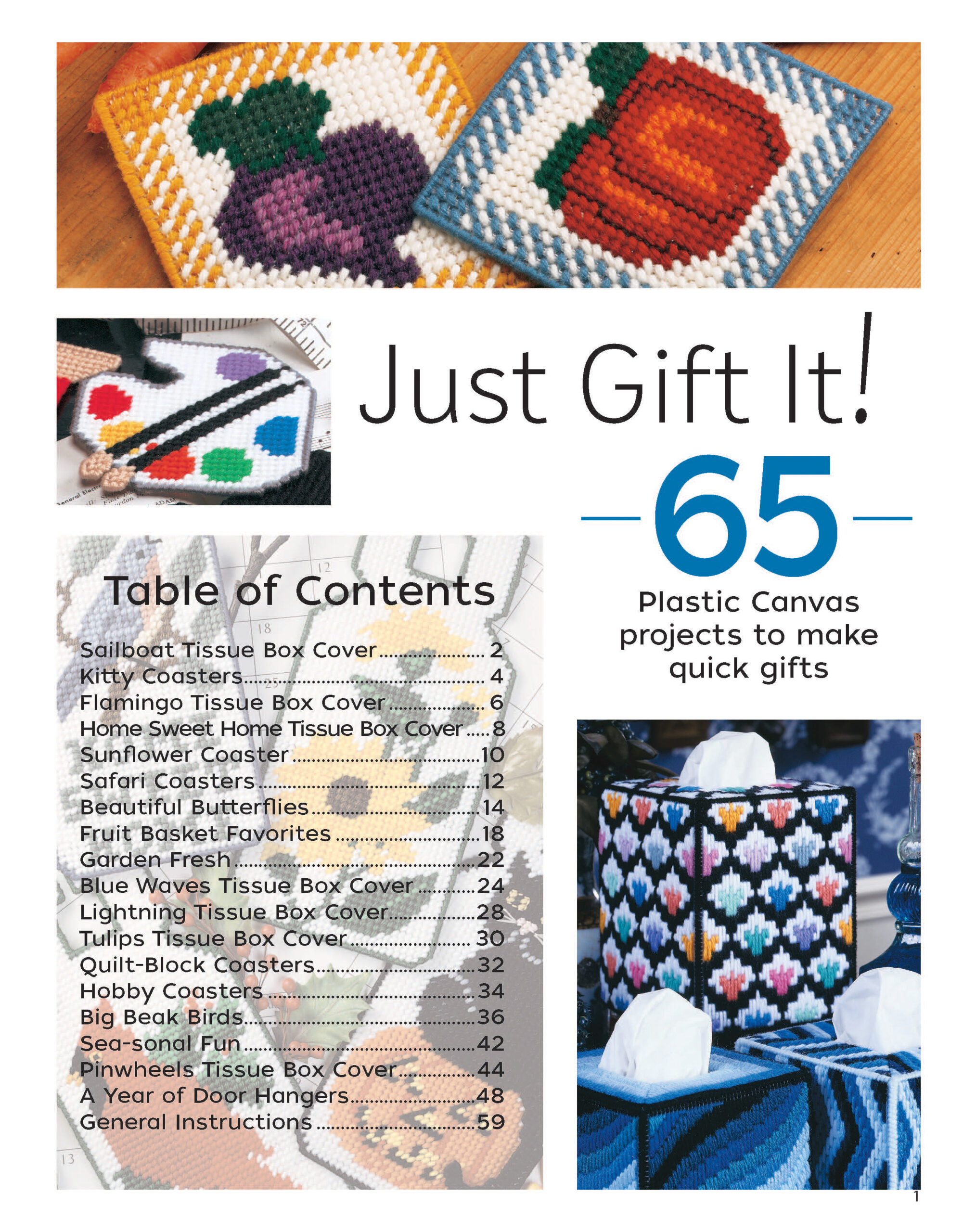 Plastic Canvas Just Gift It!- Designed for thoughtful gift giving, this includes 65 plastic canvas projects that are easy to make and perfect to give. There’s something here for every person and every area of the home. Includes colorful and functional projects like kitty coasters, flamingo tissue box covers, holiday door hangers, fruit basket favorites, big beak birds, safari coasters and more. Full-color diagrams with recommended colors, project instructions, stitch instructions and tips for working with plastic canvas included. Required materials include 7, 10 and 14 mesh plastic canvas, assorted colors of US size 4 medium weight yarn and #16, #20 and #24 tapestry needles. Beginner to intermediate skill level. 64 pages in a softcover.