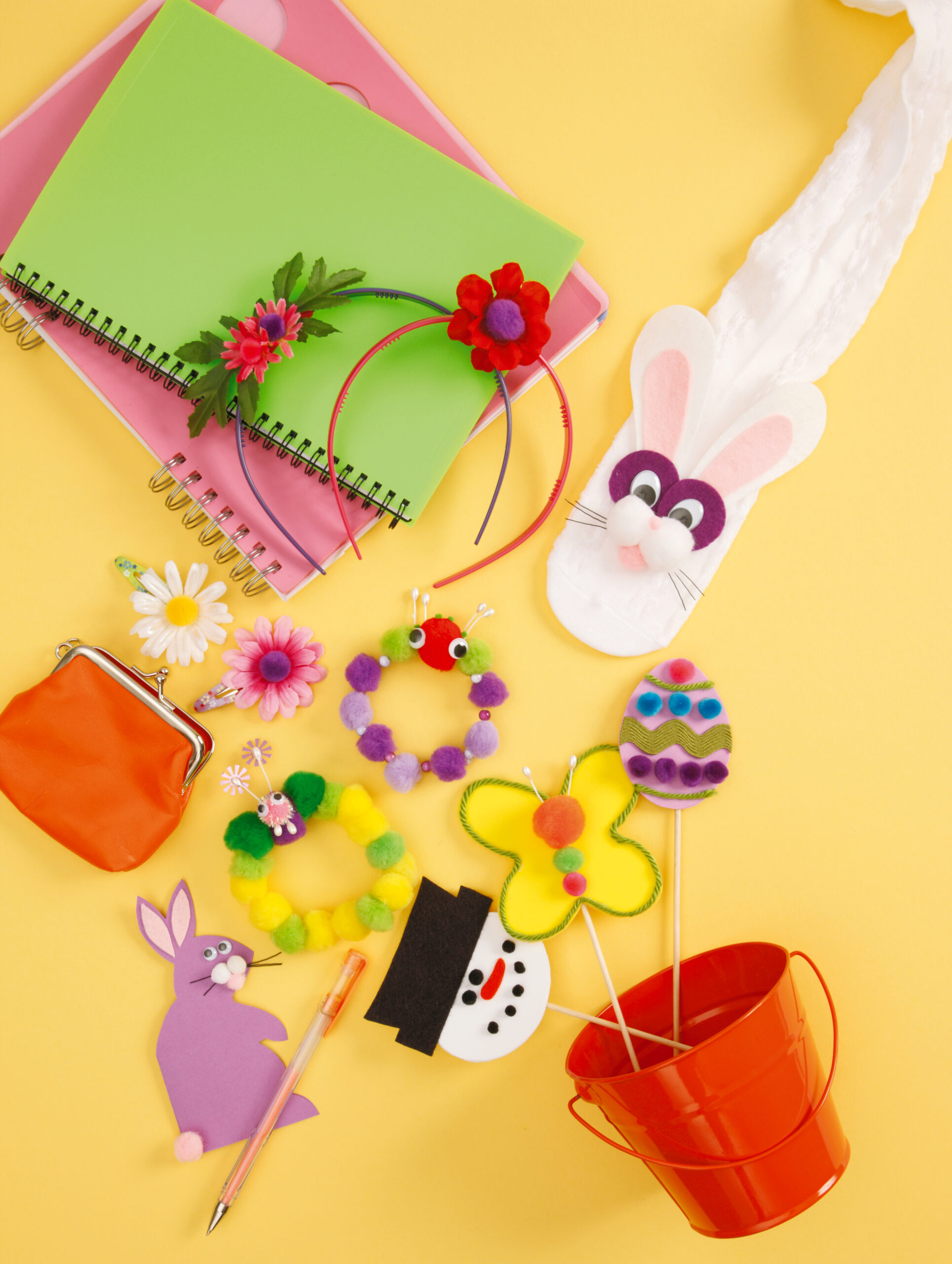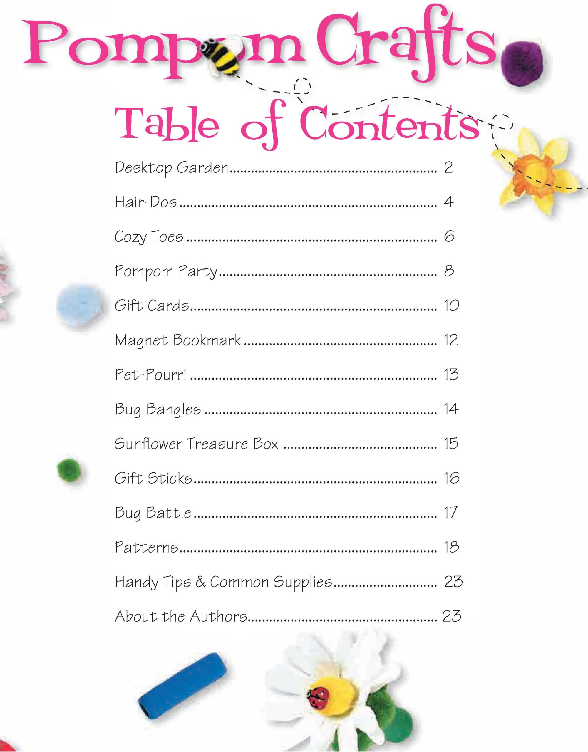 Craft Pompom Crafts- Fun and imaginative craft projects for children 7-11 years. Make a variety of flower, bug and animal designs. Projects include: butterfly stapler, flower hair clips, bug button covers, bunny socks, party cups, placemats, dinosaur card and much more. Each project can be made using craft basics like pompoms, craft foam and felt; attached with simple sewing or your choice of craft glue. Includes step-by-step instructions for each design and templates for cutting out foam or paper shapes. Easy skill level. 24 pages, softcover.