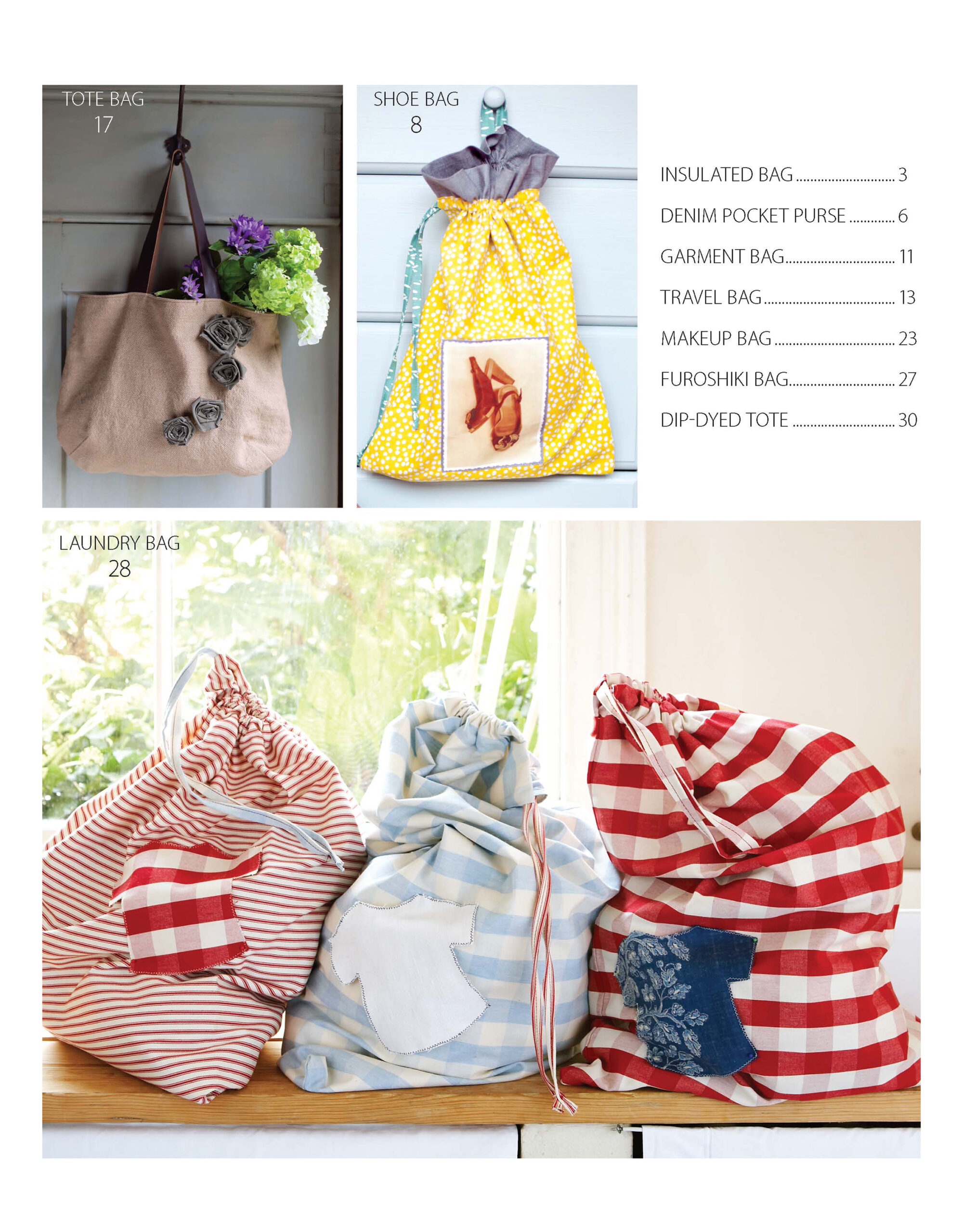 Quick & Simple Sewing Bags- Great for gifts, these 10 designs offer quick and simple bags for every purpose from travel and storage to laundry and lunch. Projects feature: insulated bag, denim pocket purse, shoe bag, garment bag, travel bag made of oilcloth, tote bag with rolled fabric roses, makeup bag, furoshiki bag, drawstring laundry bag, and dip-dyed tote. Includes: step-by-step instructions and patterns. 32 pages in a softcover.