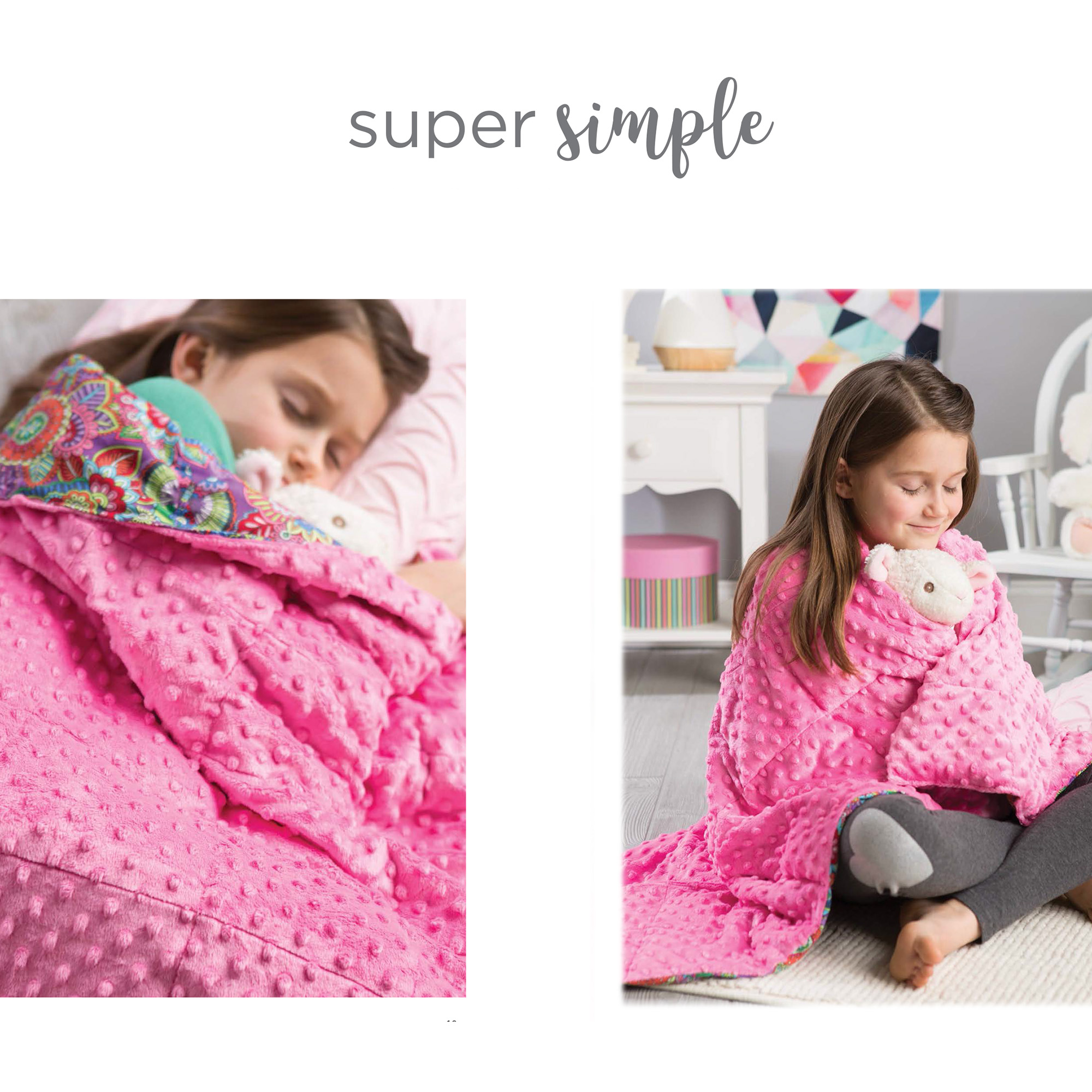 Quilting & Sewings Cozy Weighted Blankets- Sleep through the night with the stress free snuggle of a weighted blanket. Transform your sleep with 15 family friendly projects destined to help you get a better night’s rest. Even the most restless sleepers deserve stress free, and sleep filled evenings, so craft your own weighted blanket. Choose from family sized wraps, lap throws, eye mask, and neck wrap. You’ll find your perfect replacement to that childhood stuffed animal and fill your night with calming cuddles instead of restless tosses and turns. Includes shopping list, complete instructions, and tips for using plastic poly pellets, plush fabrics and piecing blocks. Not recommended for children 6 and under. Never leave a small child unattended when using a weighted blanket. 64 pages in a softcover.