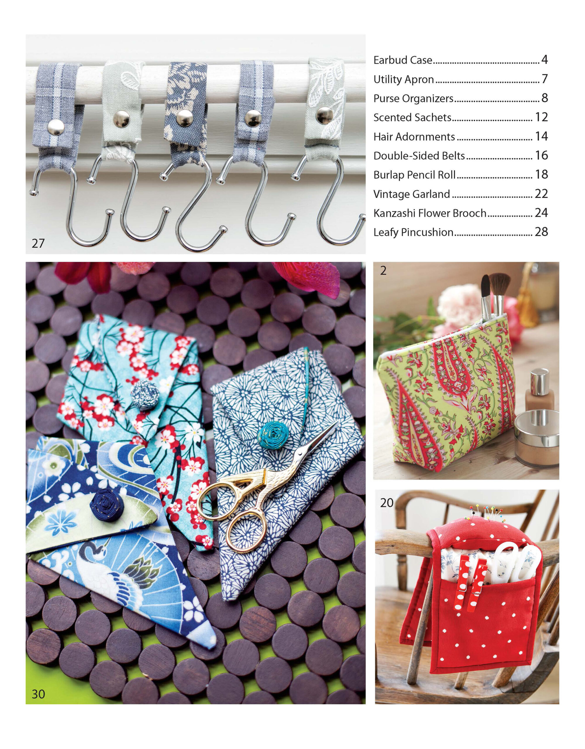 Quick & Simple Sewing Accessories- 14 quick and simple projects. Includes makeup bag, earbud case, utility apron, purse organizers, sachets, hair flowers, double-sided belts, burlap pencil roll, sewing caddy, vintage garland, Kanzashi flower brooch, accessory hanger, pincushions and scissor case. 32 pages in a softcover.