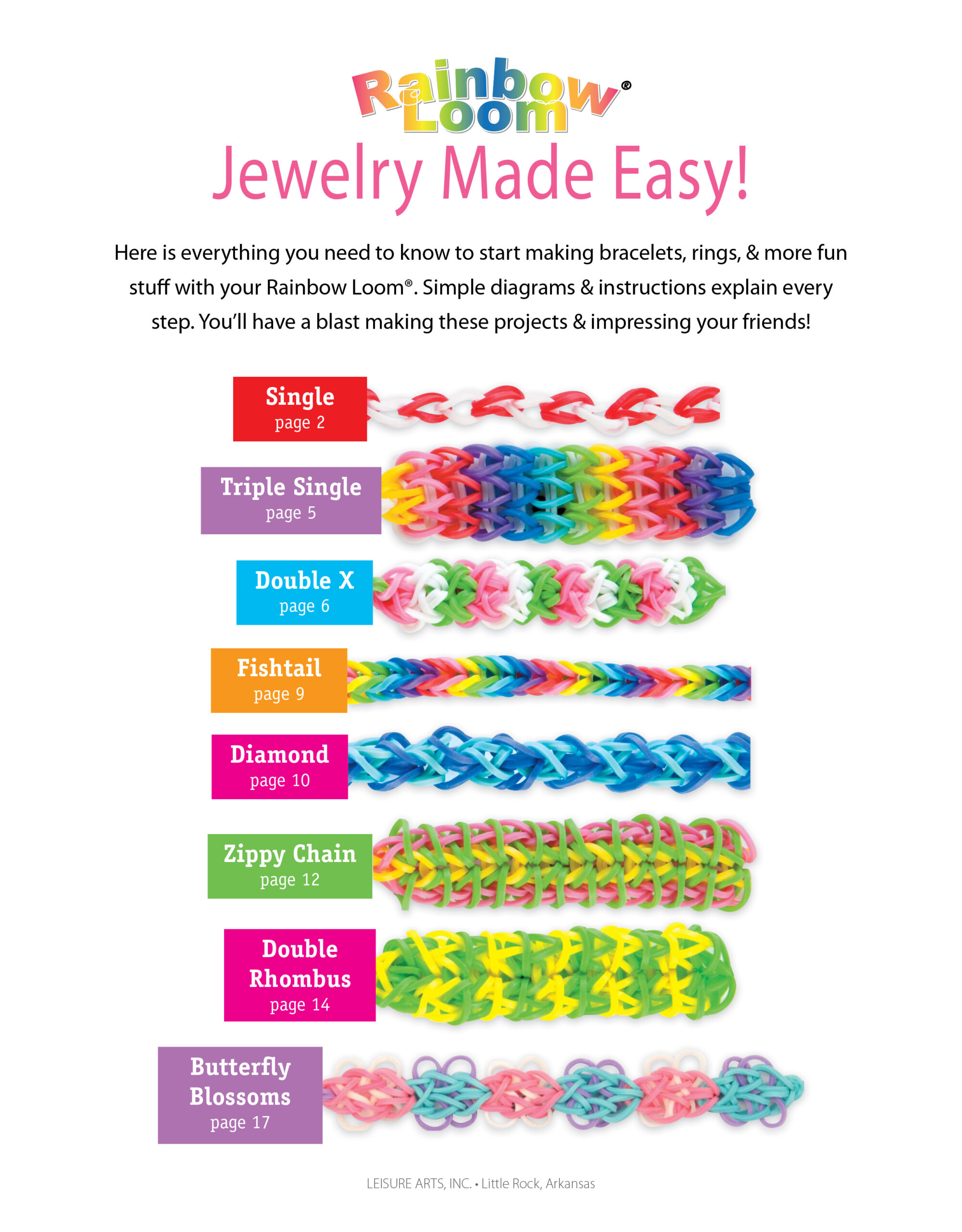 Rainbow Loom Jewelry Made Easy Crafts- Impress all your friends and family with these unique bracelets, rings, headbands, and other items. Step by step directions and 8 fun projects to make with your Rainbow Loom and colorful elastic bands. Projects include fishtail, diamond, zippy chain, butterfly blossom, and other patterns. Each project has photos and diagrams. 20 pages in a soft cover.