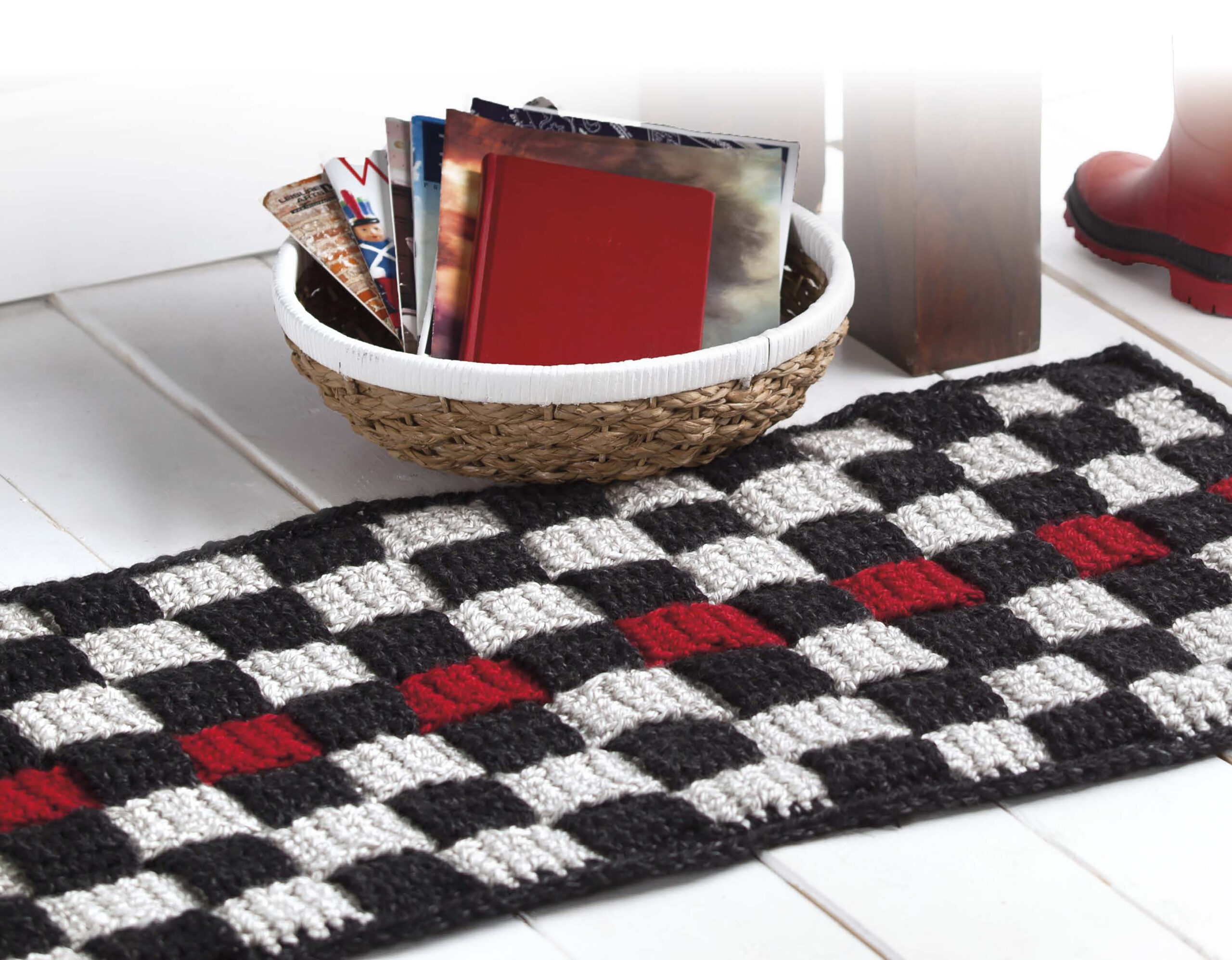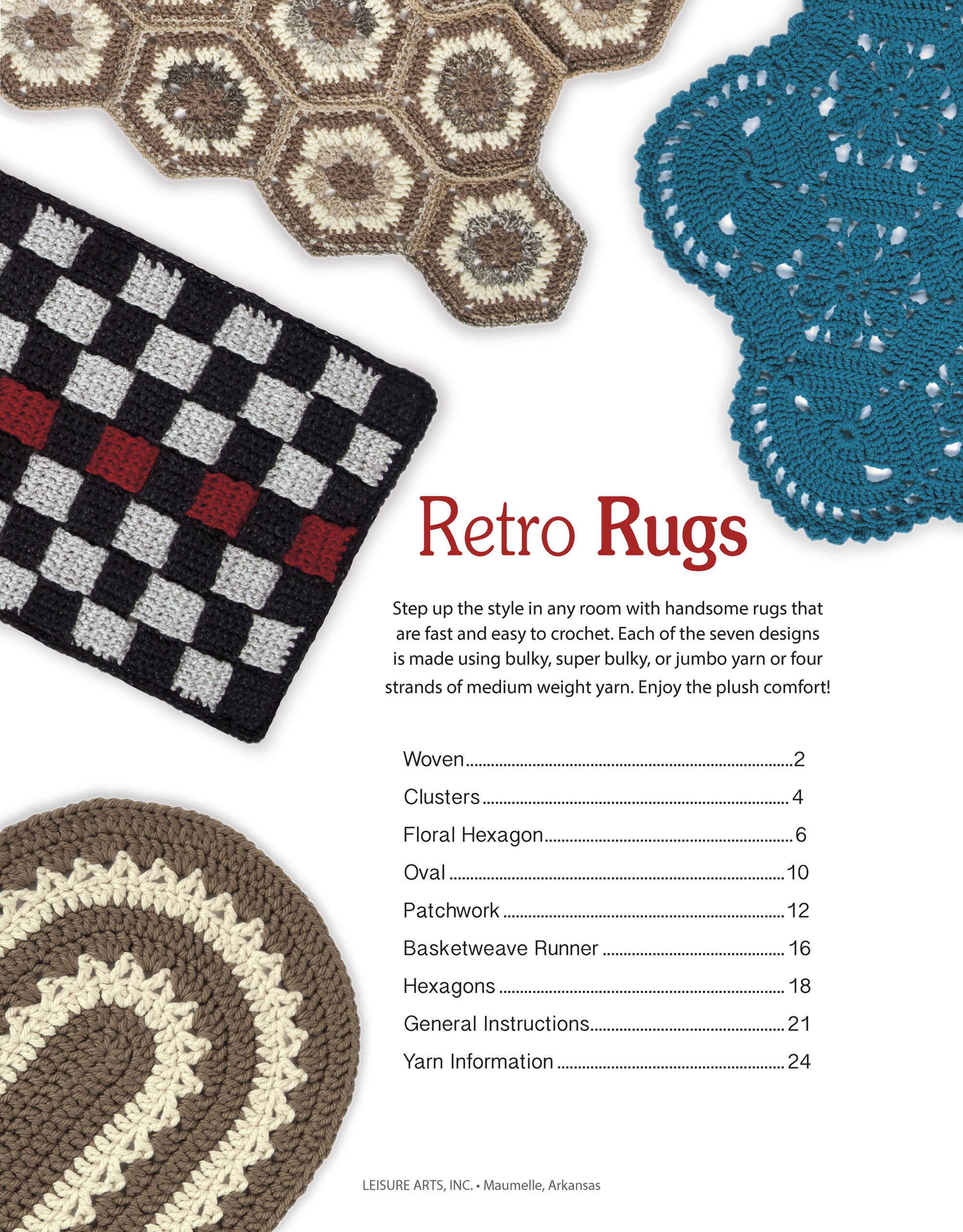 Retro Rugs- Crochet seven quick rugs from the past, refreshed with today’s wonderful yarns. Designs include woven, basketweave, clusters, hexagon and patchwork rugs. All are easy skill level. Each of the seven designs use super bulky weight, bulky weight, jumbo weigh,t or four strands of medium weight yarn. Crochet hook sizes are M, N, P and Q. 24 pages in a softcover.