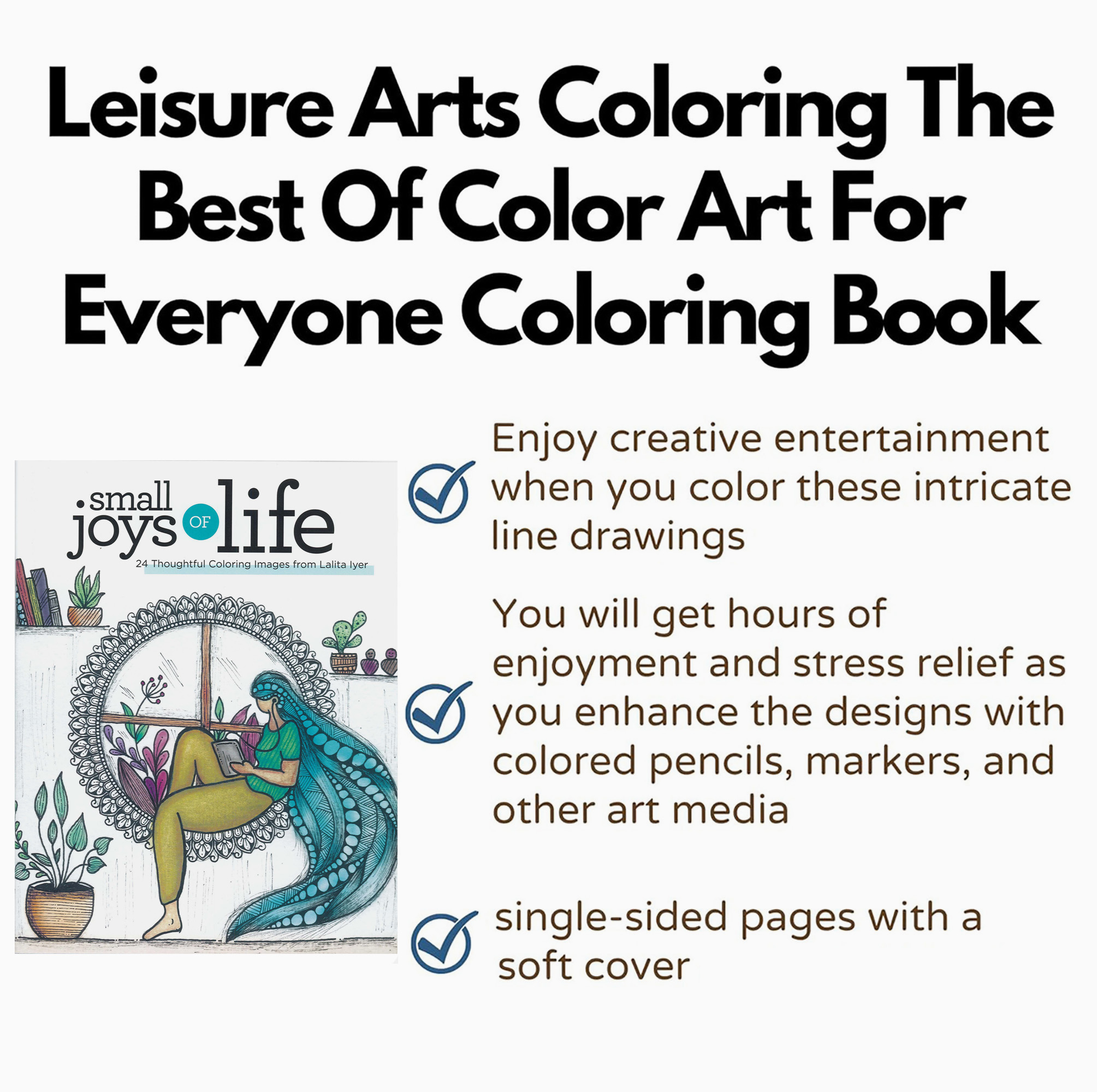 Small Joys Of Life Coloring- Create a sense of calm and happiness with these beautiful mandala illustrations. Designs include a variety of life’s small joys like cooking, reading, and meditating illustrated with mandala patterns, perfect for a relaxing afternoon of coloring. Each page is printed on one side of thick paper, with center-staple binding that allows the pages to lay flat. Great for coloring with colored pencils or fine tipped markers. 24 pages, softcover.