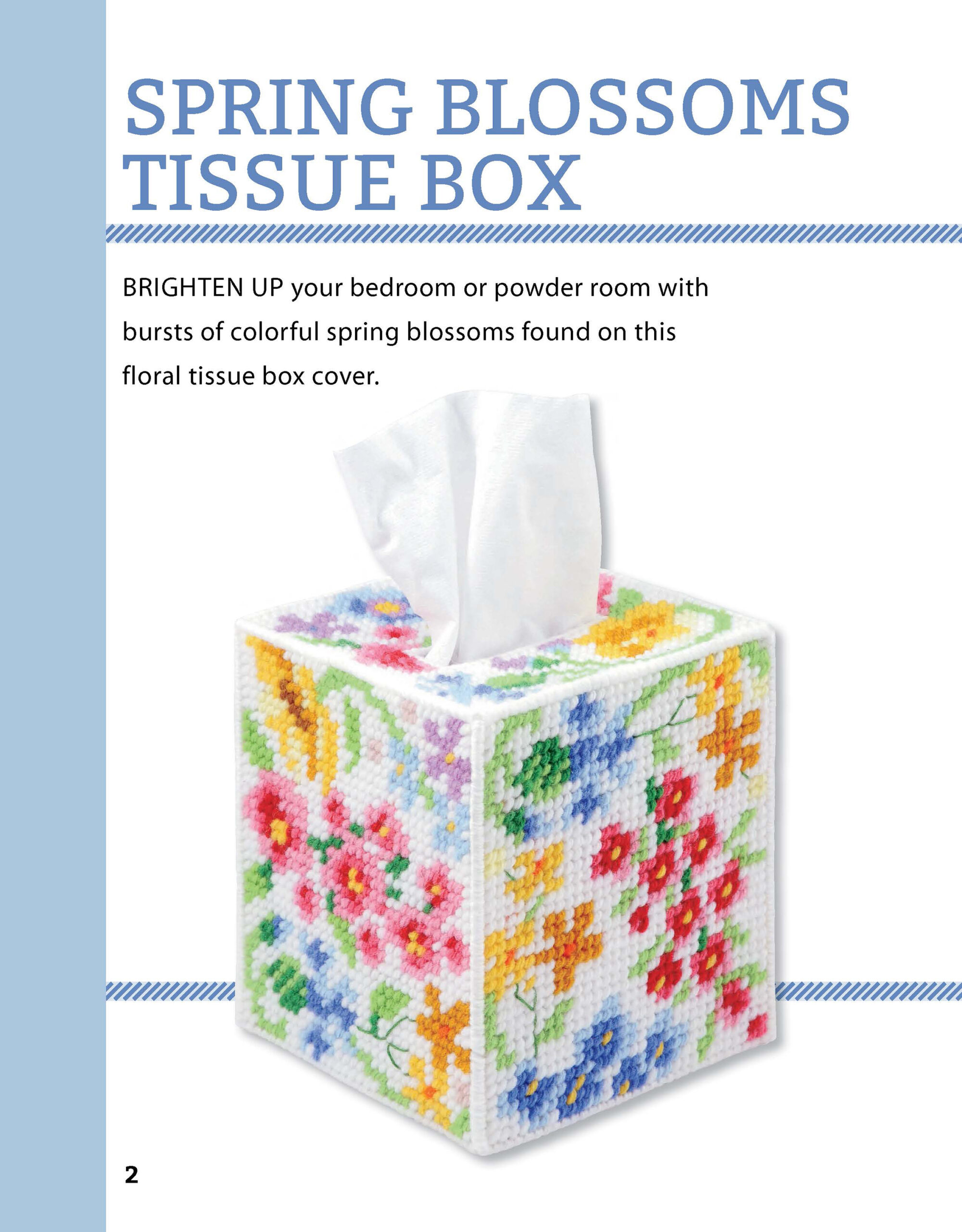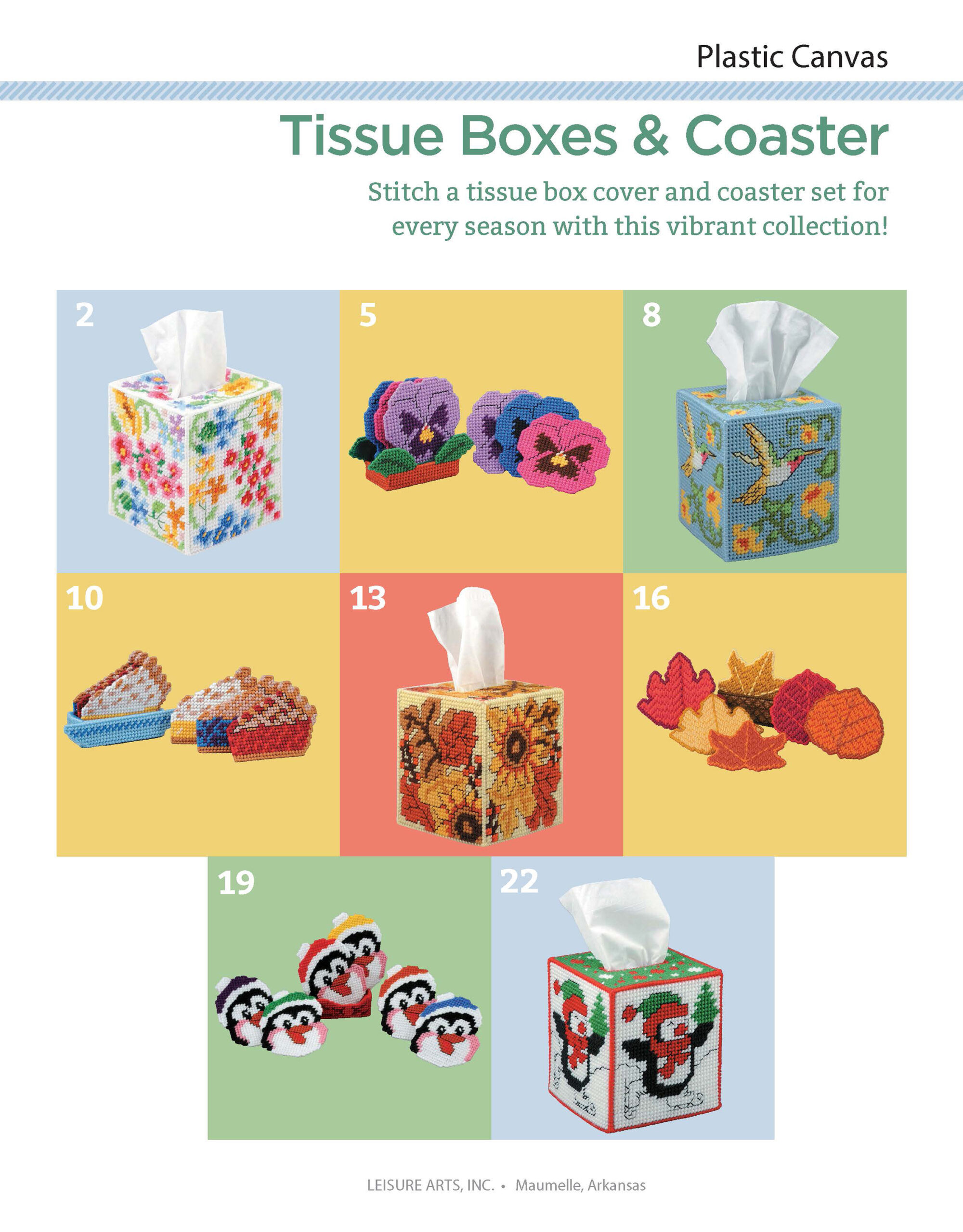 Stitchery Tissue Boxes & Coasters Plastic Canvas Herrschners- Celebrate each season with colorful plastic canvas designs for your home. Includes flowers for Spring, pie and butterflies for Summer, leaves and flowers for Autumn, and skating penguins for Winter. Coordinate your tissue box and coasters. All pieces are worked on 7-mesh plastic canvas using a size 16 tapestry needle and size 4 medium weight yarn. Floss details use 4 strands of cotton embroidery floss. 24 pages, soft cover.