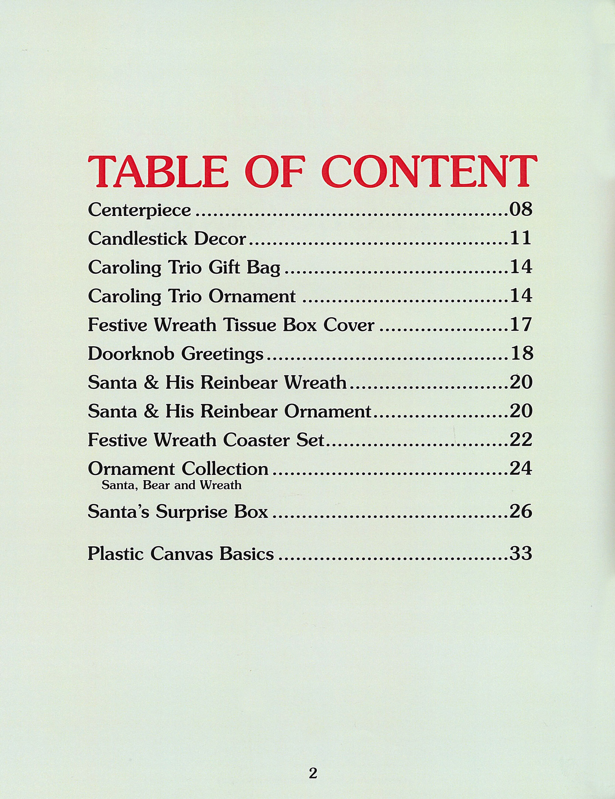 Stitcherys Santa, Bears, Bells In Plastic Canvas- Craft a piece of holiday magic for every room of your home, or as gifts for family and friends, with this Christmas-themed plastic canvas. Packed with twelve projects guaranteed to spread cheer, here’s just a sample of the holly-jolliness that awaits you: Candlestick Decor, Caroling Trio Ornament, Festive Wreath Tissue Box Cover, Doorknob Greetings, Santa & His Reinbear Wreath, and more. Each project is stitched on 7 mesh plastic canvas. Includes a guide on plastic canvas, detailed instructions and full-colored charts. Beginner friendly. 38 pages, PDF download.