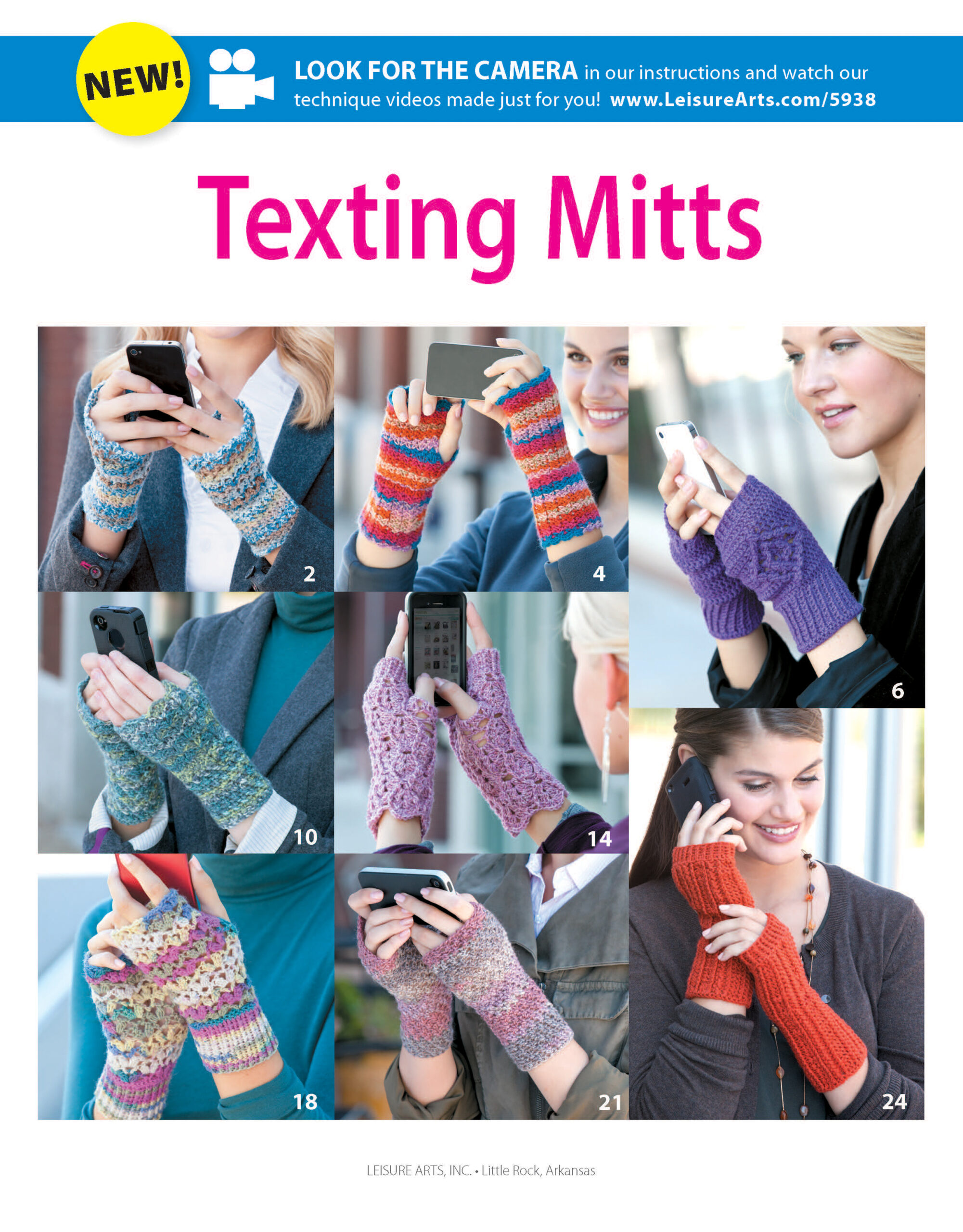 Texting Mitts Crochet- Whenever it’s cold outside, you’ll need texting mitts. These fingerless gloves keep your hands toasty while you stay in touch. These eight designs are really soft and comfy to wear because they’re crocheted with super fine weight sock yarn. Designs include: diamond back, cabled shells, chunky V, and more. Projects call for US size E-4 or F-5 crochet hooks. Includes step-by-step instructions for each design with sizing options for small, medium and large hands. Sizing options measure approximately 5 3/4″ and 7 1/4″ around. Beginner to intermediate skill level. 32 pages, softcover.