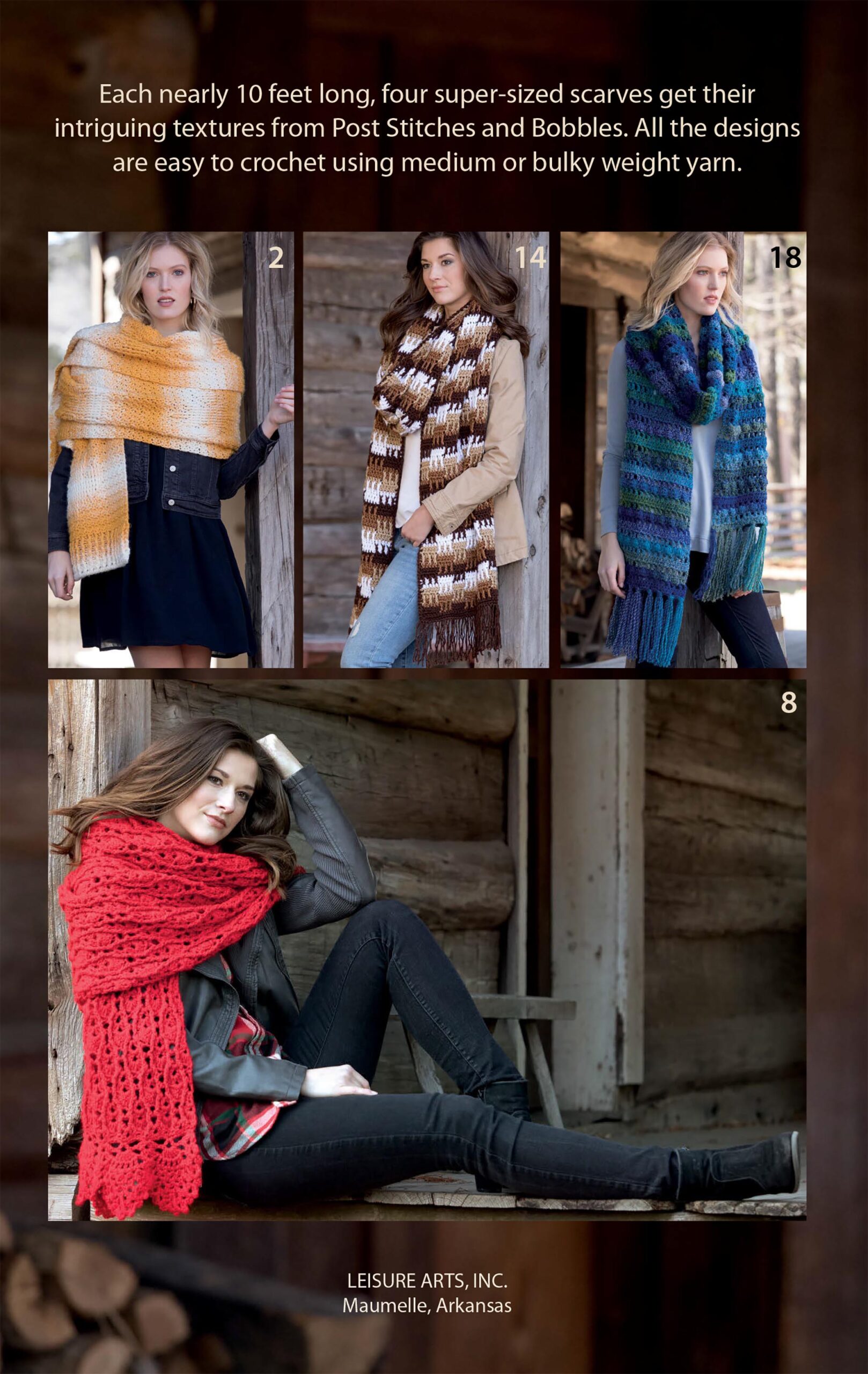 Textured Super Scarves Crochet- Each nearly 10 feet long, the four super sized scarves get their intriguing textures from post stitches and bobbles. Richly embossed with eye-catching patterns, these scarves are all easy skill level. Designs include: maple leaf, cascading lace, woven plaid, and bobbled beauty. Includes step-by-step instructions for each project and illustrated stitch guides. Patterns call for either US size 4 worsted, or 5 bulky weight yarns and a variety of larger hook sizes. Finished project sizes measures between approximately 13 1/2″x 103″ and 15″x 122″. 24 pages, softcover pocket size.