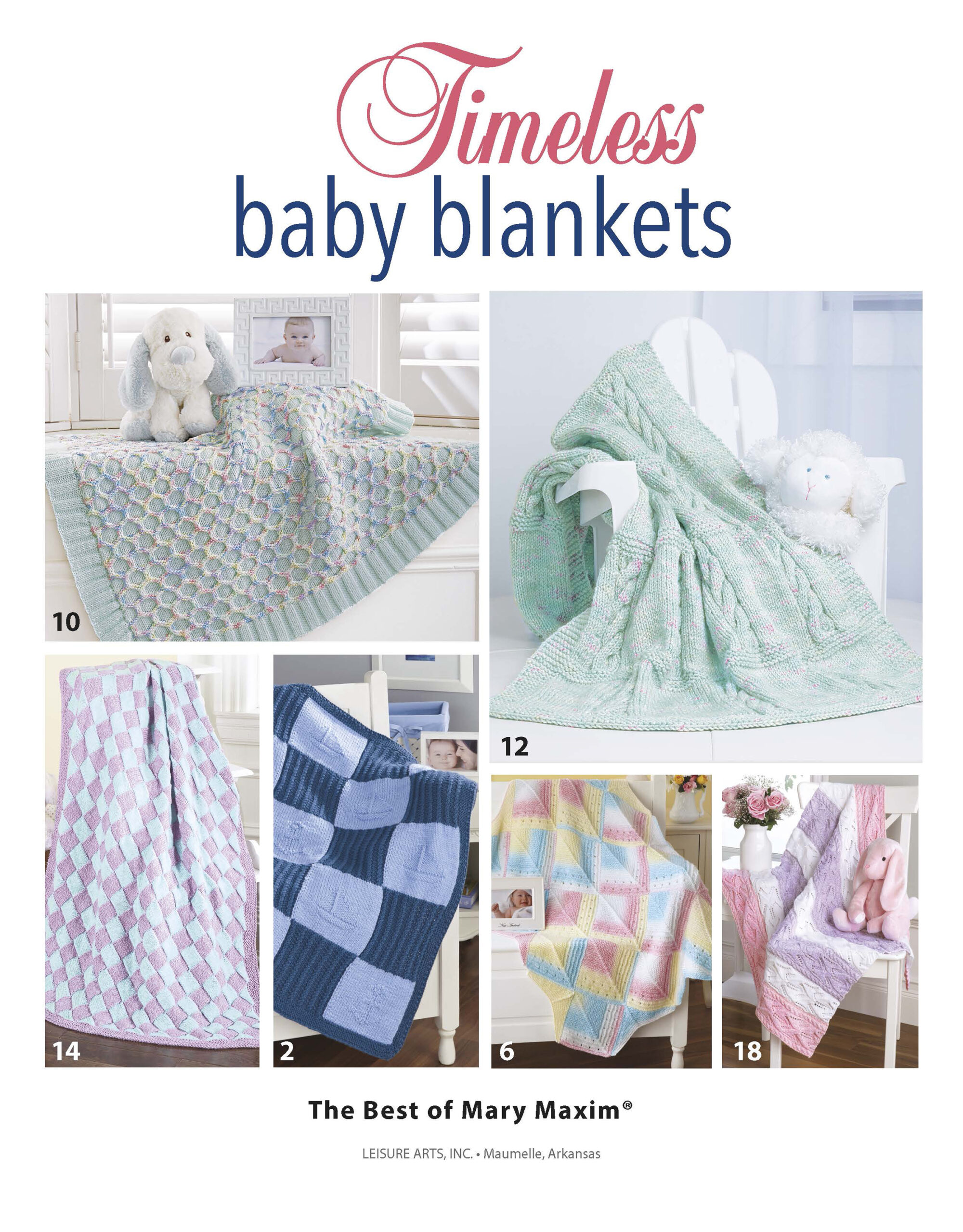 Timeless Baby Blankets- Knit classic designs for baby afghans to use as gifts for welcoming new arrivals. Six designs from the Best of Mary Maxim collection are for intermediate skill level. Knit using a variety of yarn weights from size 2 fine through size 4 medium. Uses sizes 6, 7, 8 and 9 knitting needles in a variety of lengths. 24 pages in a softcover.