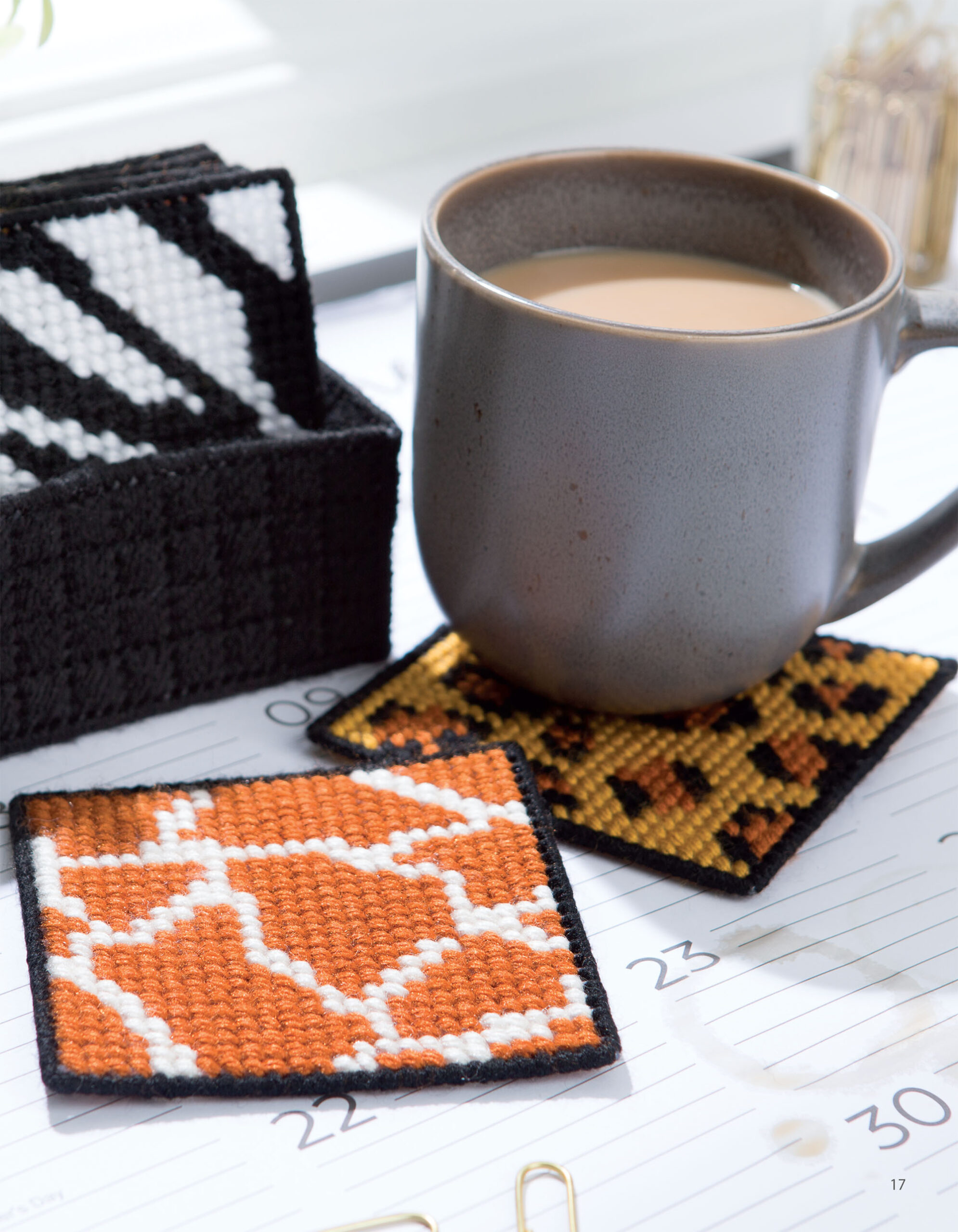Wild For Style Plastic Canvas- Take a walk on the wild side. These chic plastic canvas desk projects are designed in three exotic patterns: leopard, zebra, and giraffe. Projects include: tissue box cover, sticky note holder, desk top caddy, calendar corners, and more. The step-by-step instructions, full-color charts and a guide to plastic canvas basics make these striking projects easy and fun to make. Materials needed include US size 4 worsted weight yarn in a variety of colors, clear 7 mesh plastic canvas in a variety of piece sizes and a #16 tapestry needle. Finished projects measure between 3 3/4″x 3 1/4″ and 4 3/4″x 5 3/4″x 4 3/5″. Beginner skill level. 24 pages, soft cover.