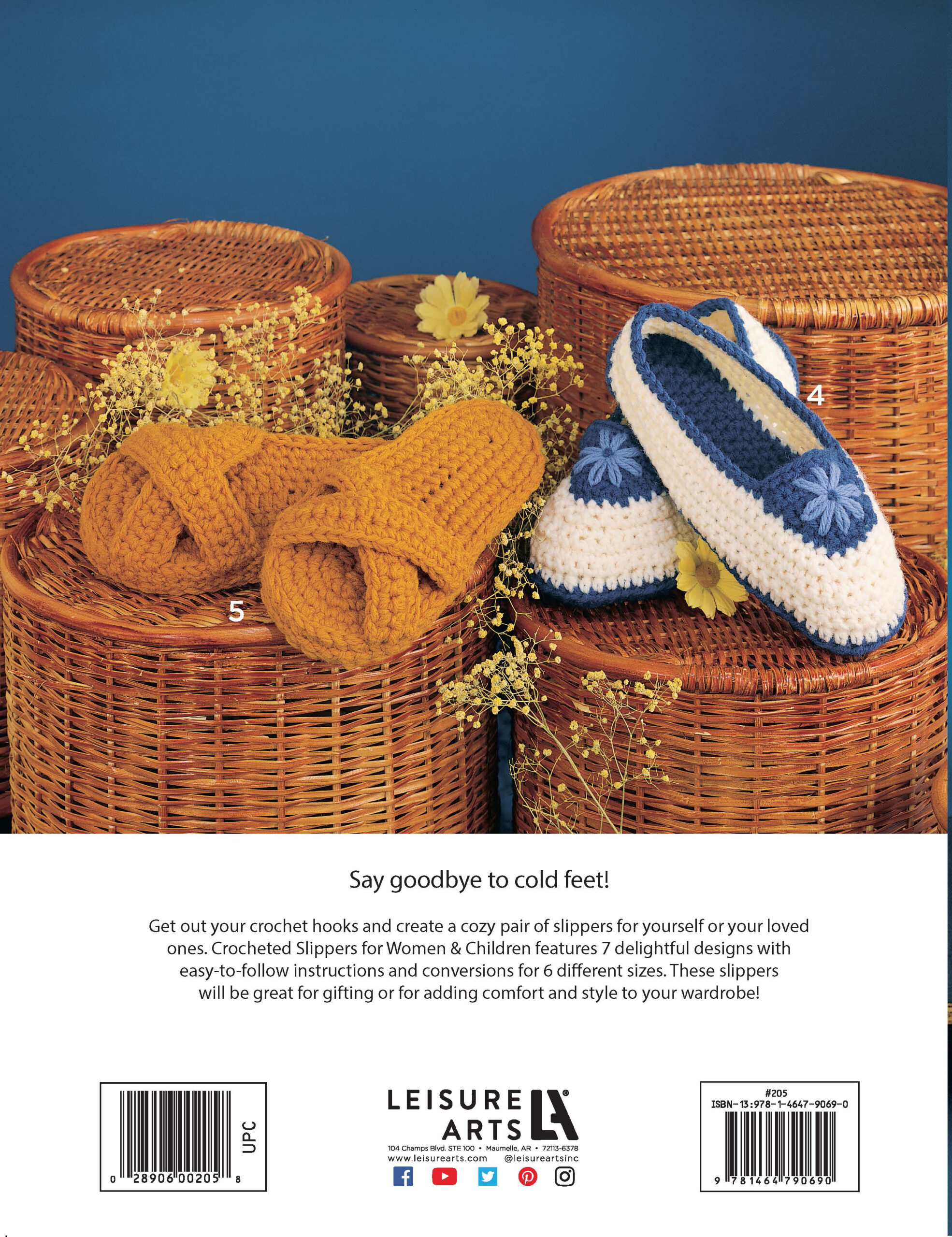 Crochet Slippers For Women and Children- Say goodbye to cold feet! Get your crochet hooks and create a pair of slippers for yourself or your loved ones. Crocheted Slippers for Women & Children features 7 delightful designs with easy-to-follow instructions and conversions for 6 different sizes. These slippers will be great for gifting or for adding comfort and style to your wardrobe. 16 pages, soft cover.