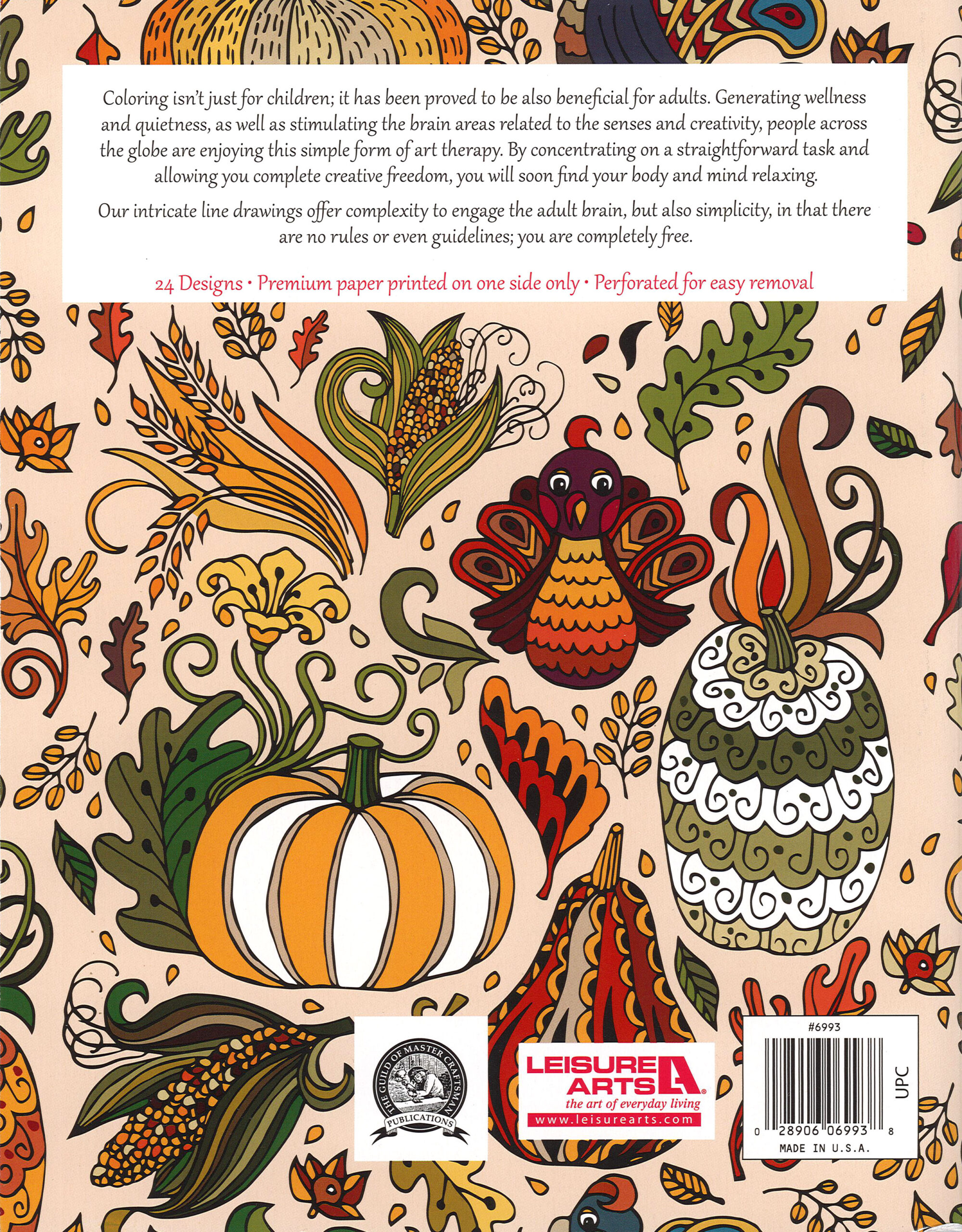 Bountiful Wonders Color Art For Everyone Coloring- Harvest your imagination with this adult coloring. 24 intricate line drawings are the gateway for your skills to grow. Whether you need to de-stress, or you want a new print for your wall, this will suit your needs. Premium paper is easily removed along the perforated edges. And no need to chose which design gets shown, each paper has only one drawing per side. Designs include: pumpkins, owls, leaves, mushrooms, and more. 50 pages in a softcover.