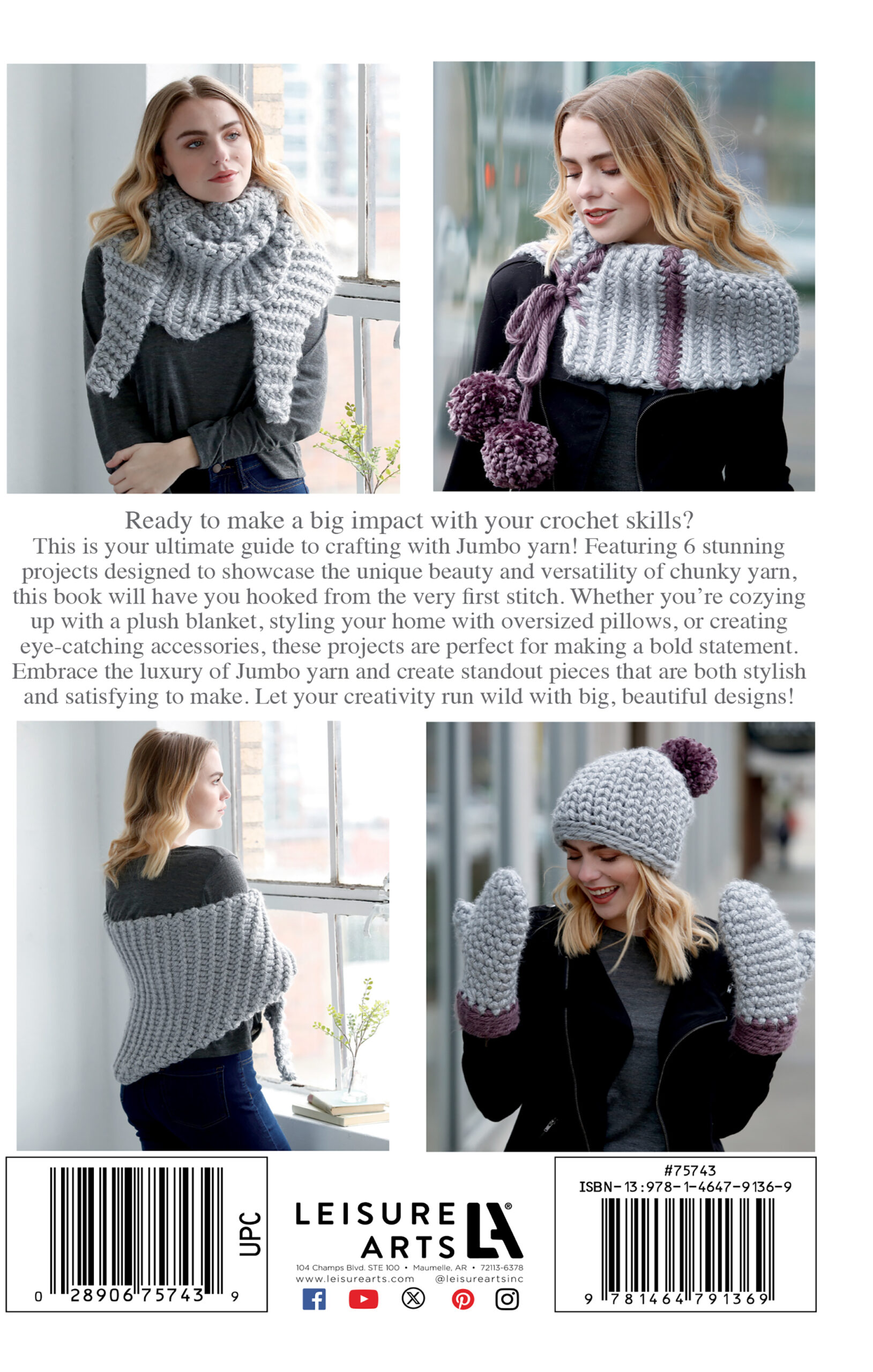 Jumbo Crochet- Create beautiful pieces in a fraction of the time using thick yarn and oversized hooks. Clear, easy-to-follow instructions for a variety of projects, from throws, pillows, shawls, and more. Perfect for both beginners and seasoned crafters, this comprehensive guide features easy skill level projects, all designed using jumbo weight 7 yarn. 38 page, softcover.