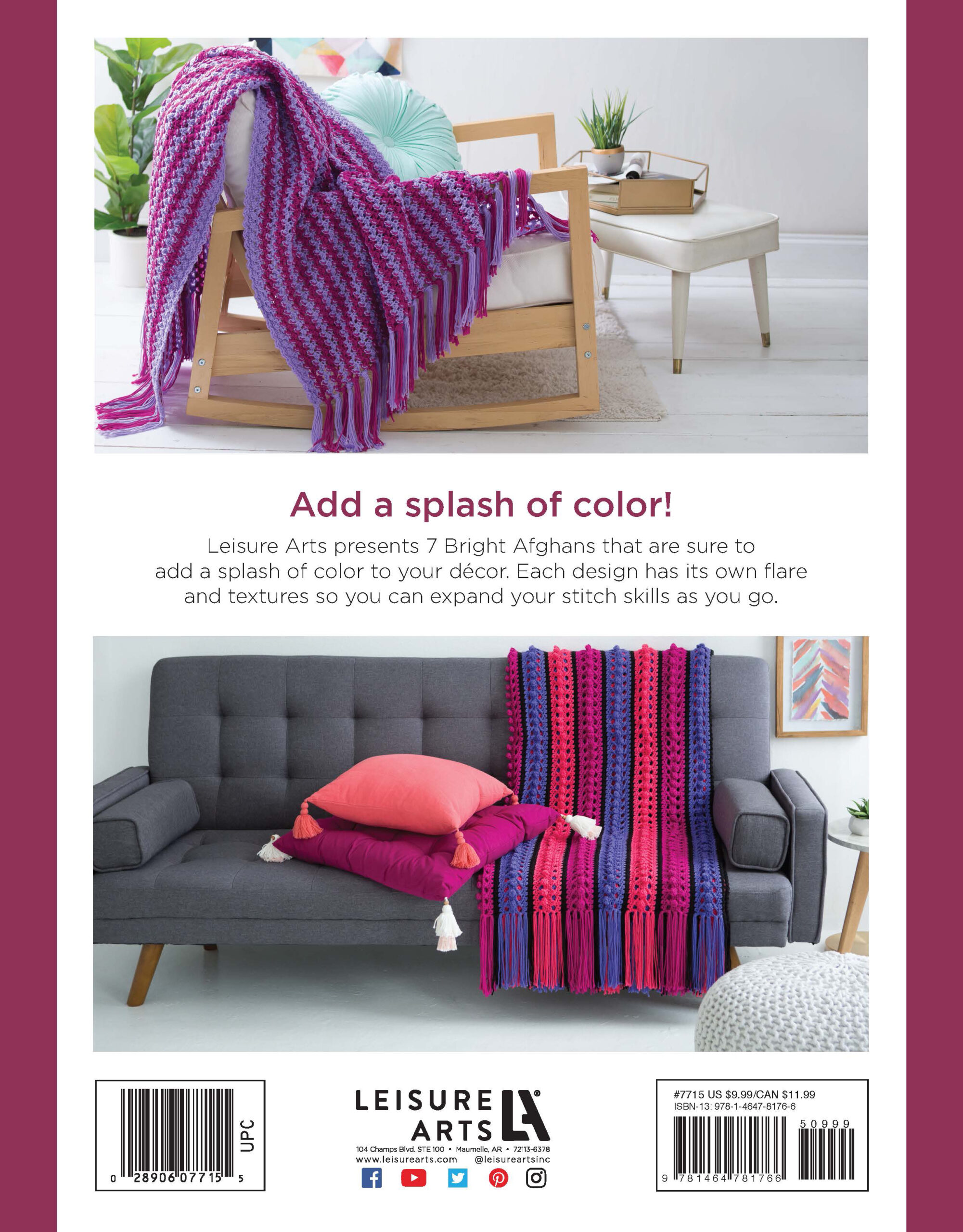 Bright Afghans Crochet- Add a splash of color to your decor. These 7 gorgeous afghans will inject vibrancy to any room you put it in or make someone's day brighter. Each design has its own flare and texture so you can expand your crocheting skills as you go. Step-by-step instructions for all 7 beginner projects make it easy for any skill level to complete these projects. Designs include: beach volley, super diva, psychedelic, meeting the parallels, and more. 48 pages, soft cover.