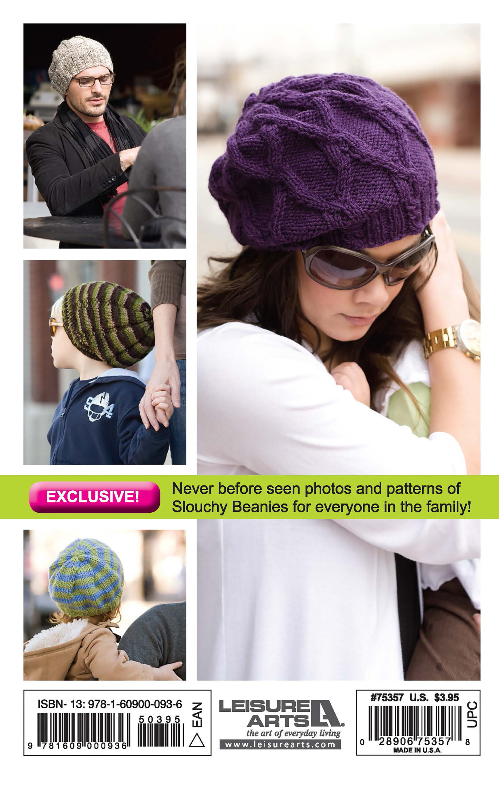 Celebrity Slouchy Beanies For The Family Knit- The rich and famous are wearing slouchy beanies wherever they go, and now you can knit seven designs like those. State your celebrity style in one of five high-fashion beanies for adults. If you know a toddler who loves to look adorable, make that tot a bright beanie with horizontal stripes. An older child will shine in the spotlight of your attention while wearing the two-in-one reversible beanie. All of the hats were designed for medium weight yarn and can be knitted a combination of circular and double pointed knitting needles in a range of standard US sizes. Includes step-by-step instructions for each design. Some designs include instructions for multiple sizing options. Easy skill level. 32 pages, softcover pocket size.