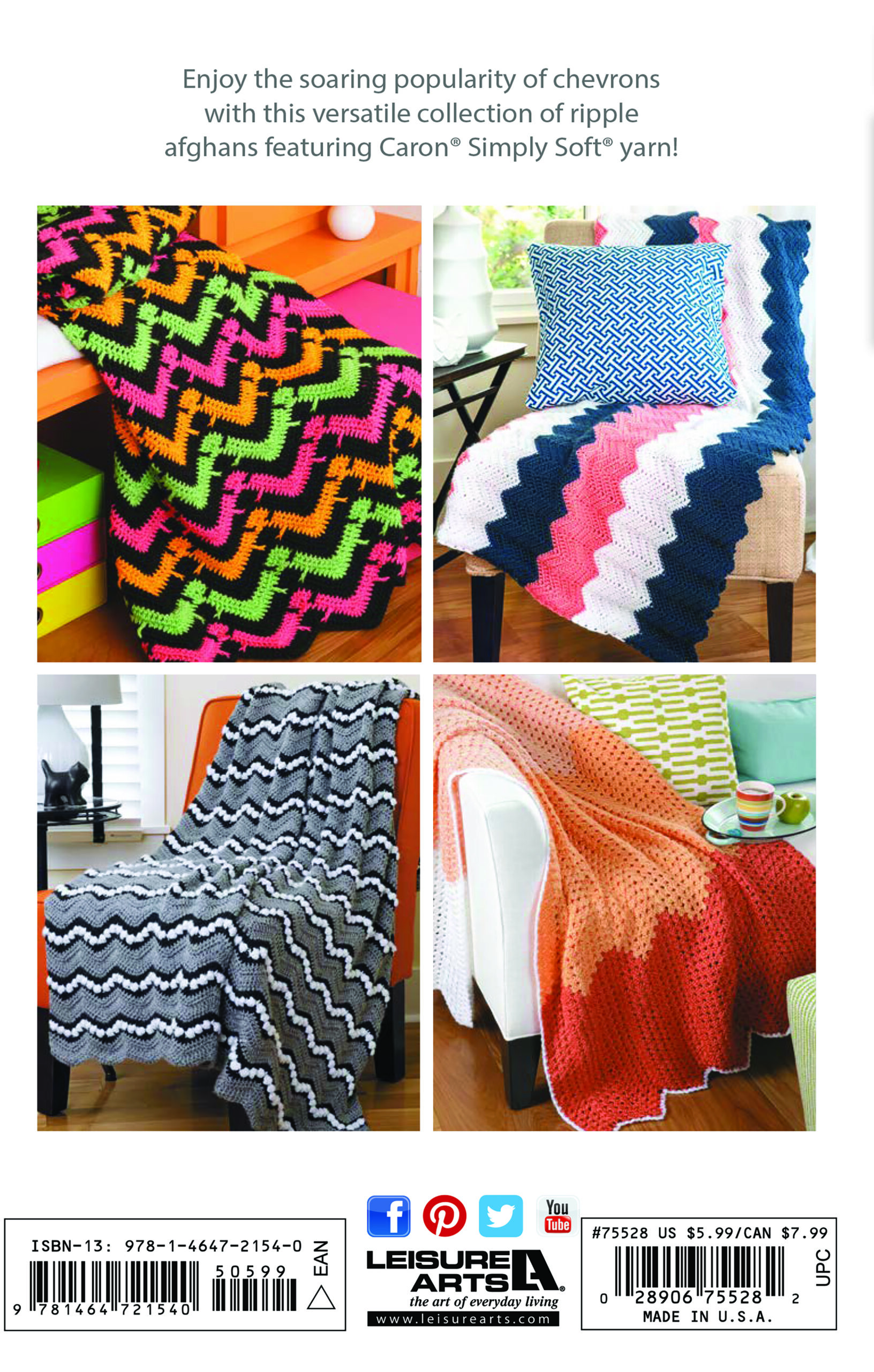 Chevron Afghans Crochet- Enjoy the soaring popularity of chevrons with these versatile designs. Change up the color combos to fit your aesthetic with these trendy throws. Bright and bold, neutrals, or soft colors, the choice is yours. Designs include: basic ripple, dynamic chevron, lacy chevron, snowcapped ripple, and more. Projects call for size 4 medium weight Caron Simply Soft yarn and crochet hooks in US sizes H-8 and I-9. Includes row-by-row instructions and stitch guides for each design. Finished afghans measure between approximately 46"x 64' and 49 1/2"x 69 1/2". Beginner to intermediate skill level. 48 pages, softcover pocket size.